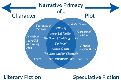 To be clear, this does not mean that speculative fiction doesn’t value characters, or that literary fiction doesn’t value plot. Both do. Instead, it is a question of where on the spectrum a particular work in a specific genre is likely to fall. For historical and cultural reasons, literary fiction works are likely to place characters at their narrative heart, while speculative fiction works are likely to diminish character’s primacy in favor of plot, world-building, setting, or other creative priorities.