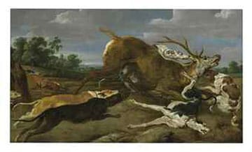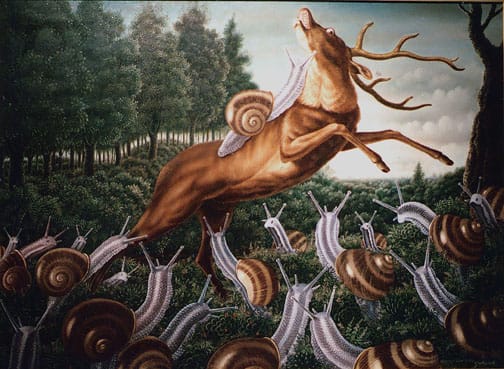 But then there are honest ‘homages’ – artistic, creative tributes to a another respected or admired artists in the form of works that allude to their work. Gervasio Gallardo did that in his fine oil painting on stretched canvas, from the mid 1980s, whose theme was clearly inspired by the famous c. 1700 painting by Dutch painter Paul de Vos, “Stag Attacked by a Pack of Hounds.”
