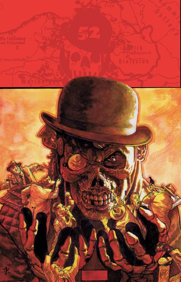 More recently, Harris returned to this storytelling era with B. Clay Moore for The Whistling Skull, a 6-issue mini-series published by DC under the JSA Liberty Files banner. The eponymous Skull is a comically grotesque-looking hero working in Europe to thwart Nazi advances. The current Skull is just one of a long line of Skulls (similar to Lee Falk’s Phantom), and the current Skull can pull on the memories of all the past, departed Skulls.