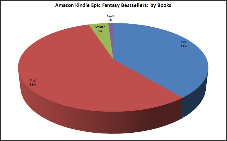 Traditional publishing continues to dominate with 56% of the books published through that route. Self-publishing still is doing well with nearly 40%. Small press and Amazon titles makes up very few of the overall list.