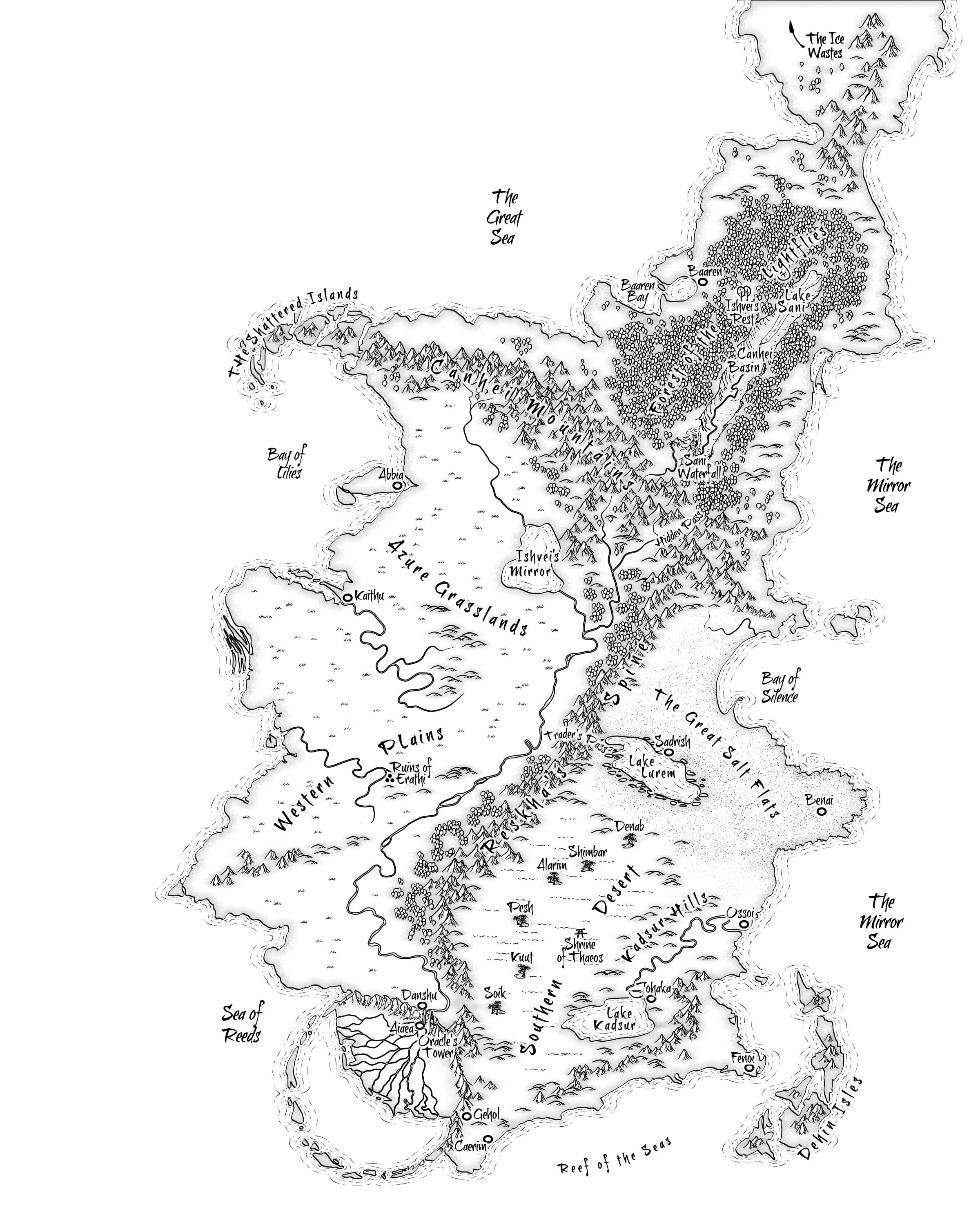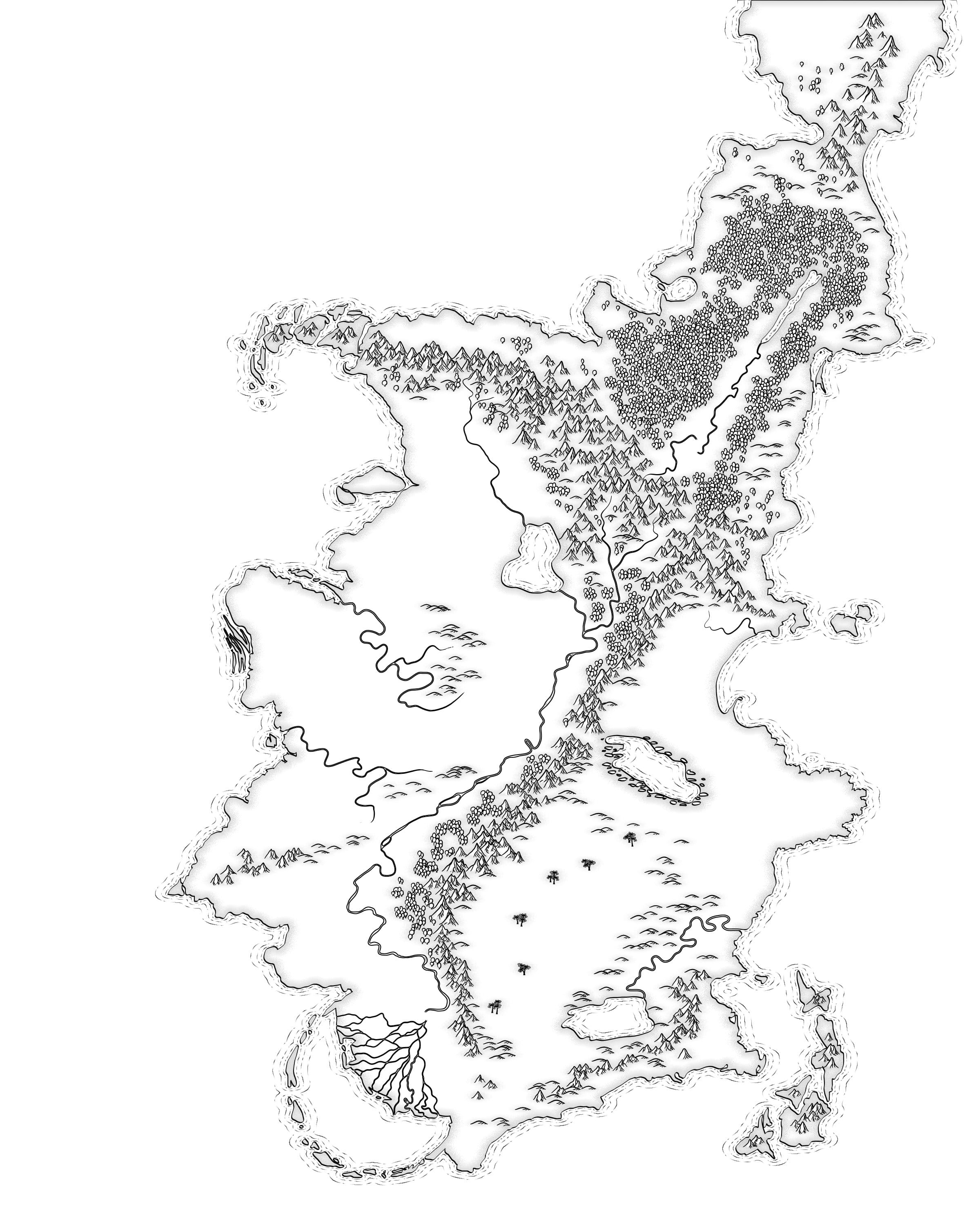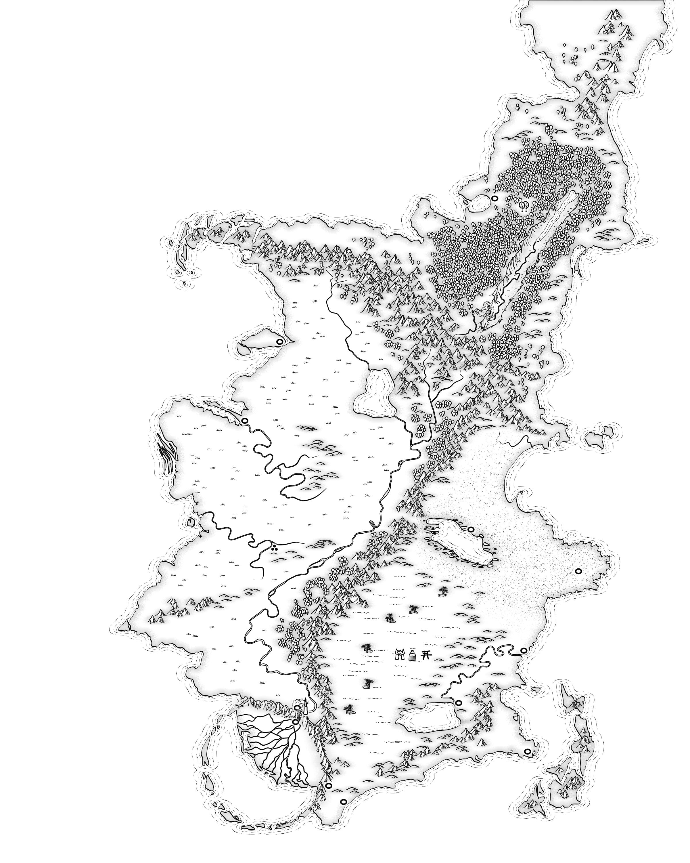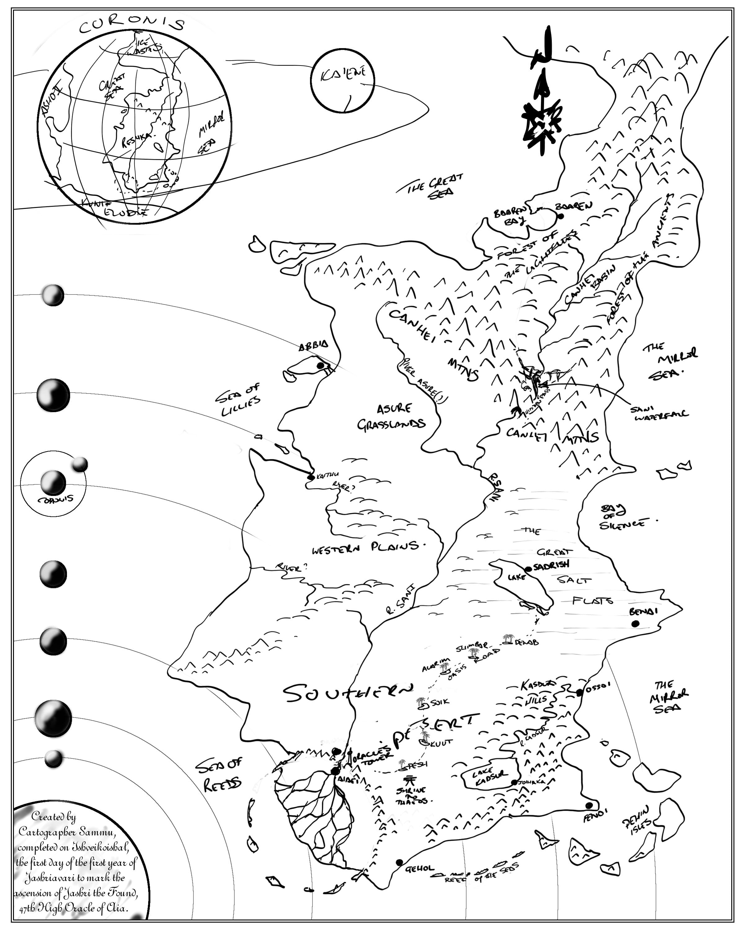I emailed him my crappily drawn maps that were a couple of years old and had almost no useful information on them, along with my text-based notes on the locations of cities, their names and other geological bits and pieces that were important to the plot. I also explained I wanted a map that was commemorative, designed by a cartographer to commemorate a religious event, the symbolic ‘this is the land you govern’ map from a culture which calligraphy and the written word as the highest art form.