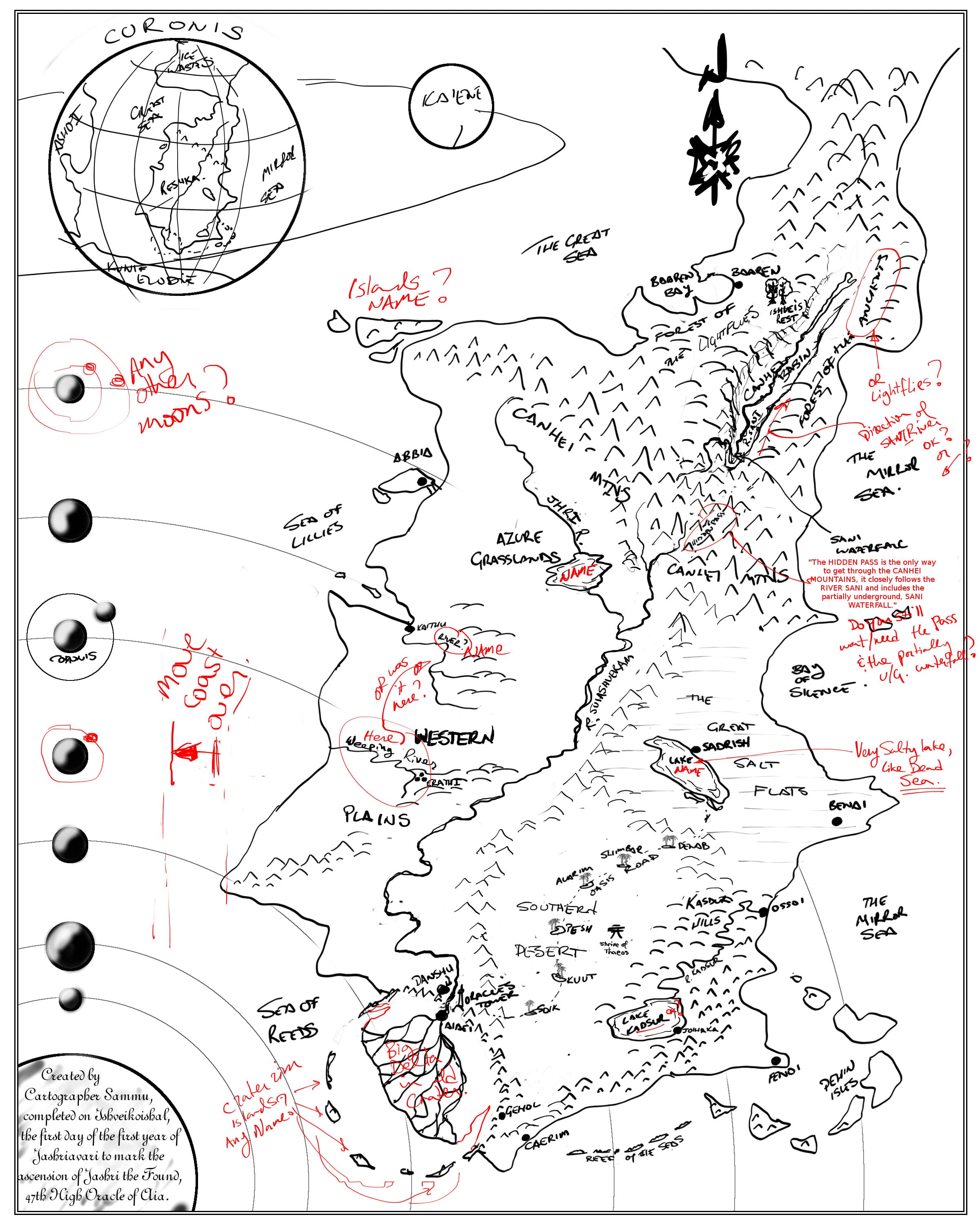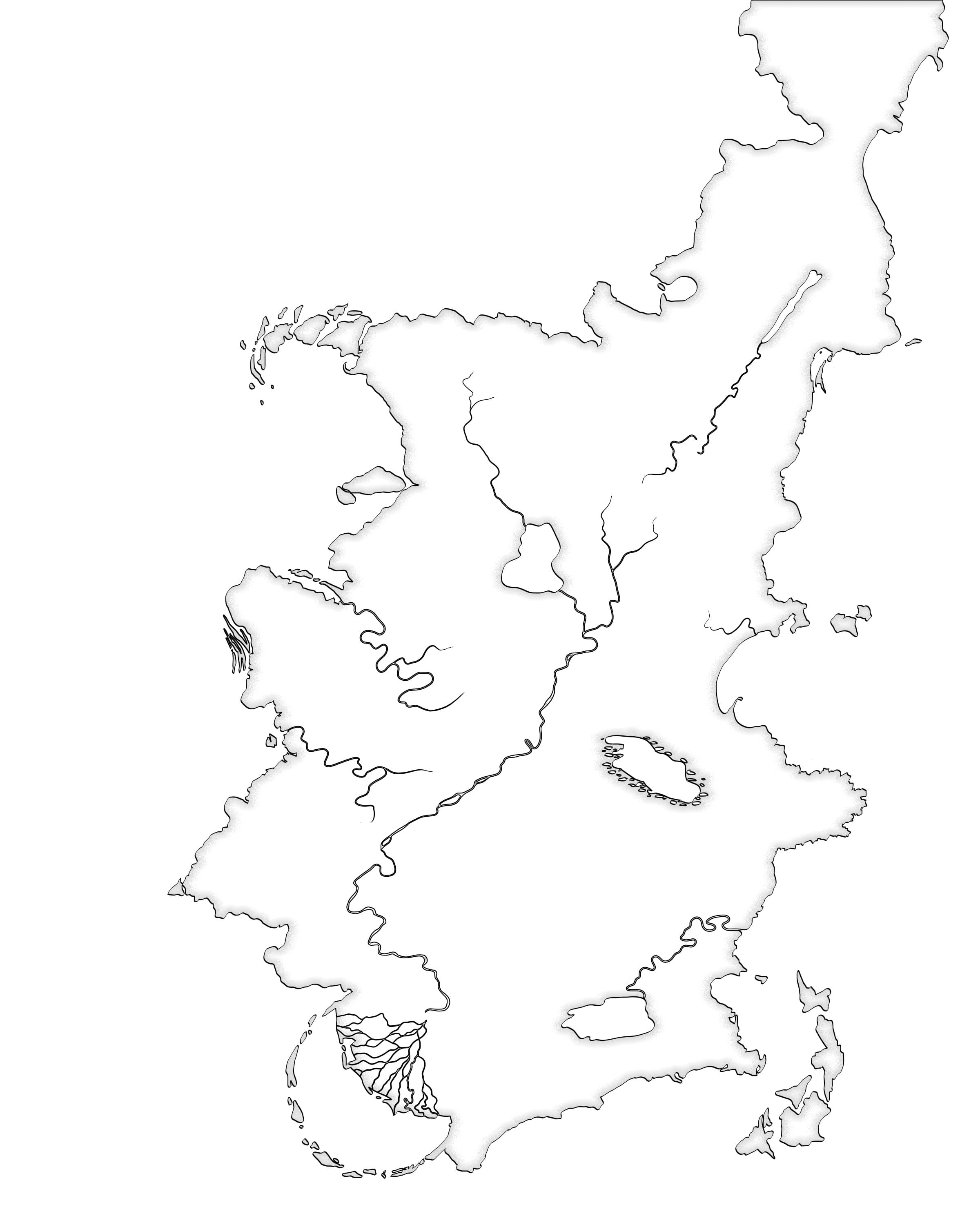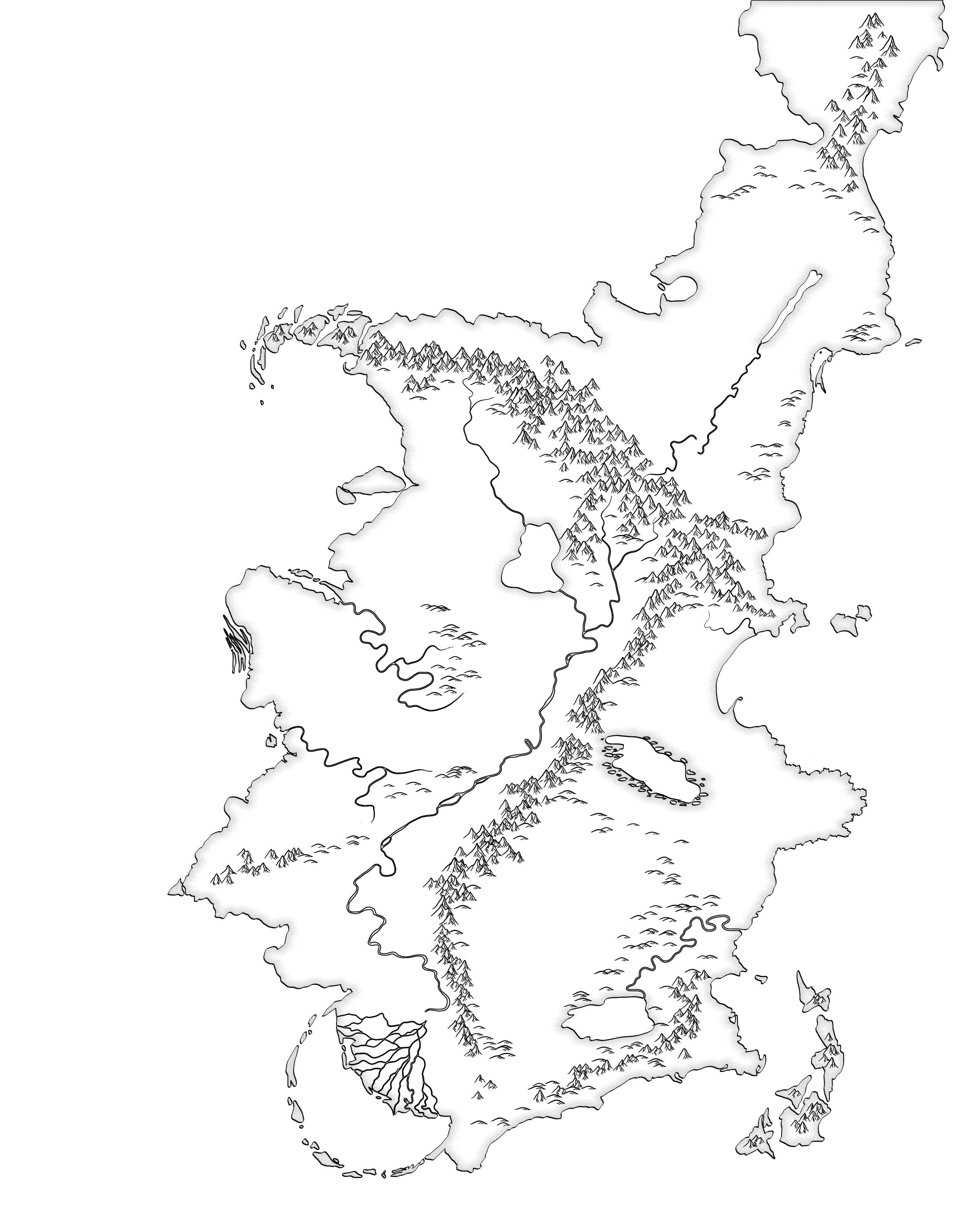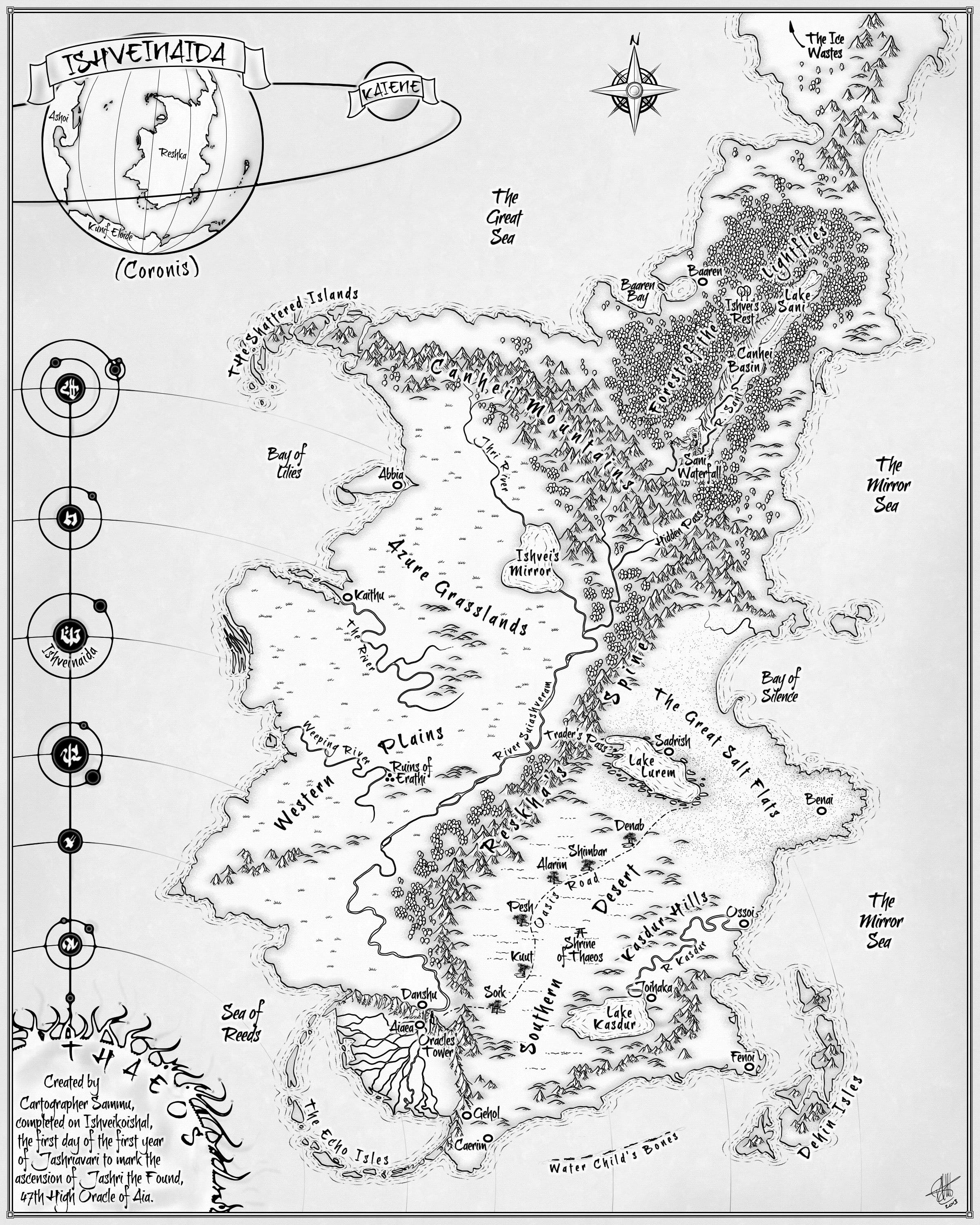 I emailed him my crappily drawn maps that were a couple of years old and had almost no useful information on them, along with my text-based notes on the locations of cities, their names and other geological bits and pieces that were important to the plot. I also explained I wanted a map that was commemorative, designed by a cartographer to commemorate a religious event, the symbolic ‘this is the land you govern’ map from a culture which calligraphy and the written word as the highest art form.