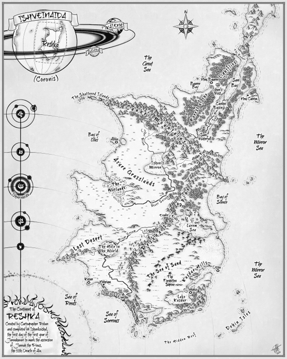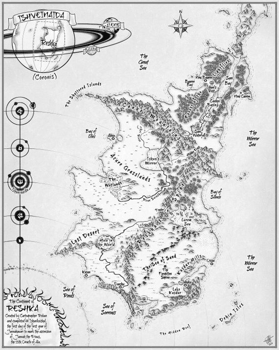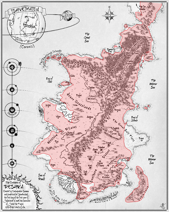 The final map – Reshka 2.0 – showed the world of Coronis as it will be. There are shuttle ports and strange new landmarks whose stories have not yet been written. This is a short post simply because pictures do so much more than words ever could. Needless to say the final maps will allow me to complete books 2 and 3 in the trilogy but also have something accurate and strangely beautiful to add to the books when they are published.