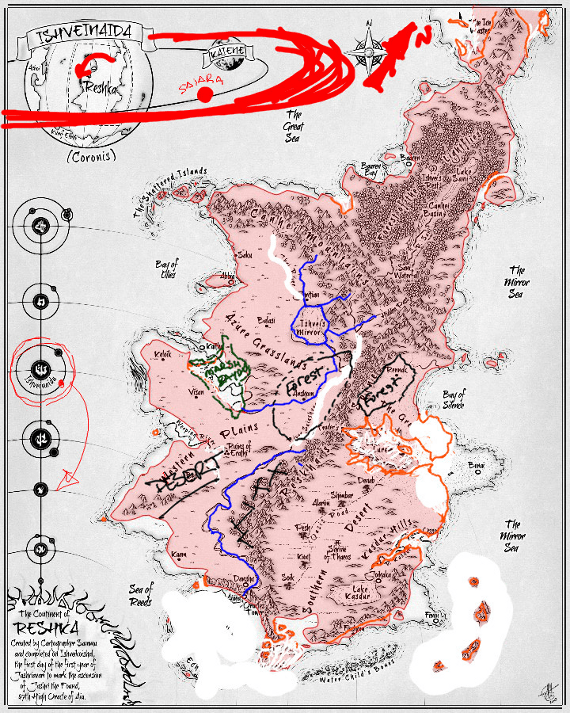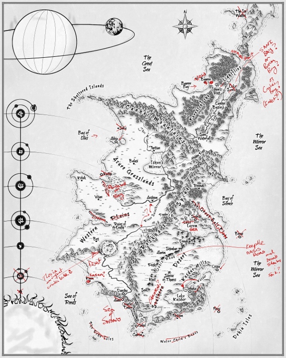 He presented me with marked up versions that showed how the coastlines might change, how the many islands would be affected and how the planet itself would change; gaining a second moon and rings of debris from worlds destroyed during the moment violent solar activity the star system has ever seen. Red pen ripped my world to shreds and then came the rebuilding process.
