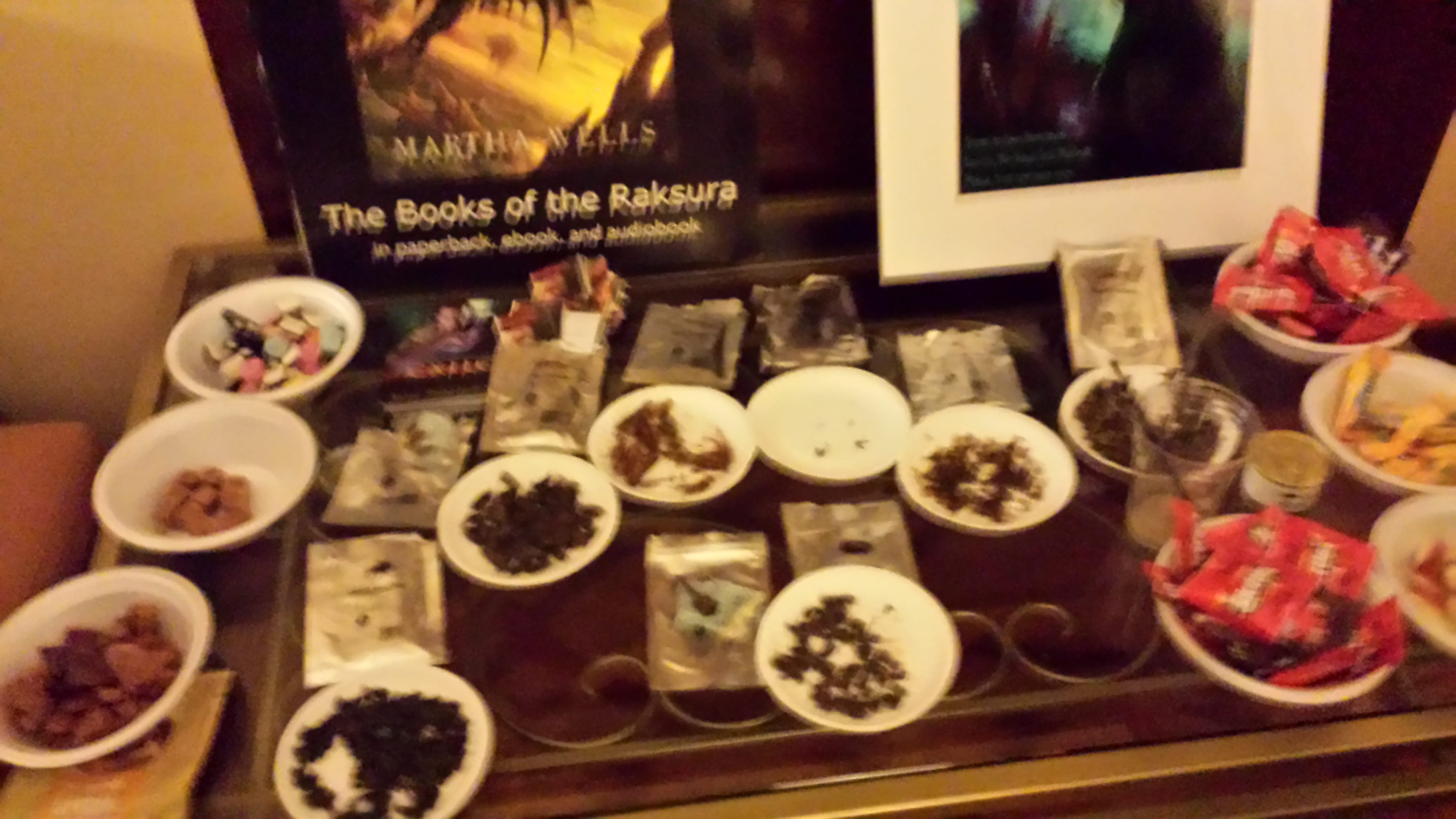 Thursday night I went party hopping. The best by far was the Bookswarm party, which had the theme Eat a Bug, Get a Book. (I ate a mole cricket and a dung beetle and got copies of Exile by Betsy Dornbusch and the last copy of The Other Half of the Sky edited by Athena Andreads.) The best thing about the party, though, was that I got to meet some of the best new fantasy writers working today. In addition to Martha Wells (whom I’ve met multiple times because we live in the same state), I met Courtney Schafer, Brad Beaulieu, Zachary Jernigan, and Douglas Hulick. If you haven’t read them, I strongly recommend you do.