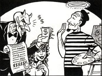 I’m not saying there aren’t people who are honestly doing it “just for the love of it.” Of course there are people who don’t need money to justify their efforts. Some artists are compelled to create, or to spend inordinate amounts of time on their creations despite no obvious reward. THAT IS NOT WHAT I MEAN BY “BETTER”. I am using “better” in a conceptual, symbolic sense. In the sense that we collectively believe that people driven by self-expression and “vision” to create art is a higher calling than those driven by the promise of “filthy lucre” – tantamount to selling your soul to the devil. And conversely, it leads to the devaluing of artists who are seen as creating for the purpose of gaining some reward, monetary or other. Artists are supposed to be above capitalism, beyond the mundane wants of everyday middle-class existence, indifferent to other than “artistic reasons” for creating art. They must be, and remain, pure (as the cartoon above implies)