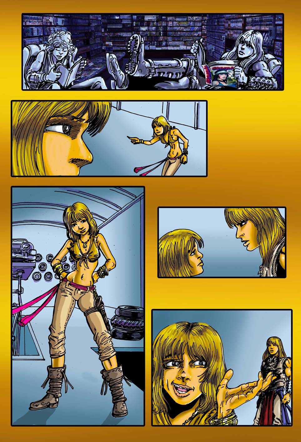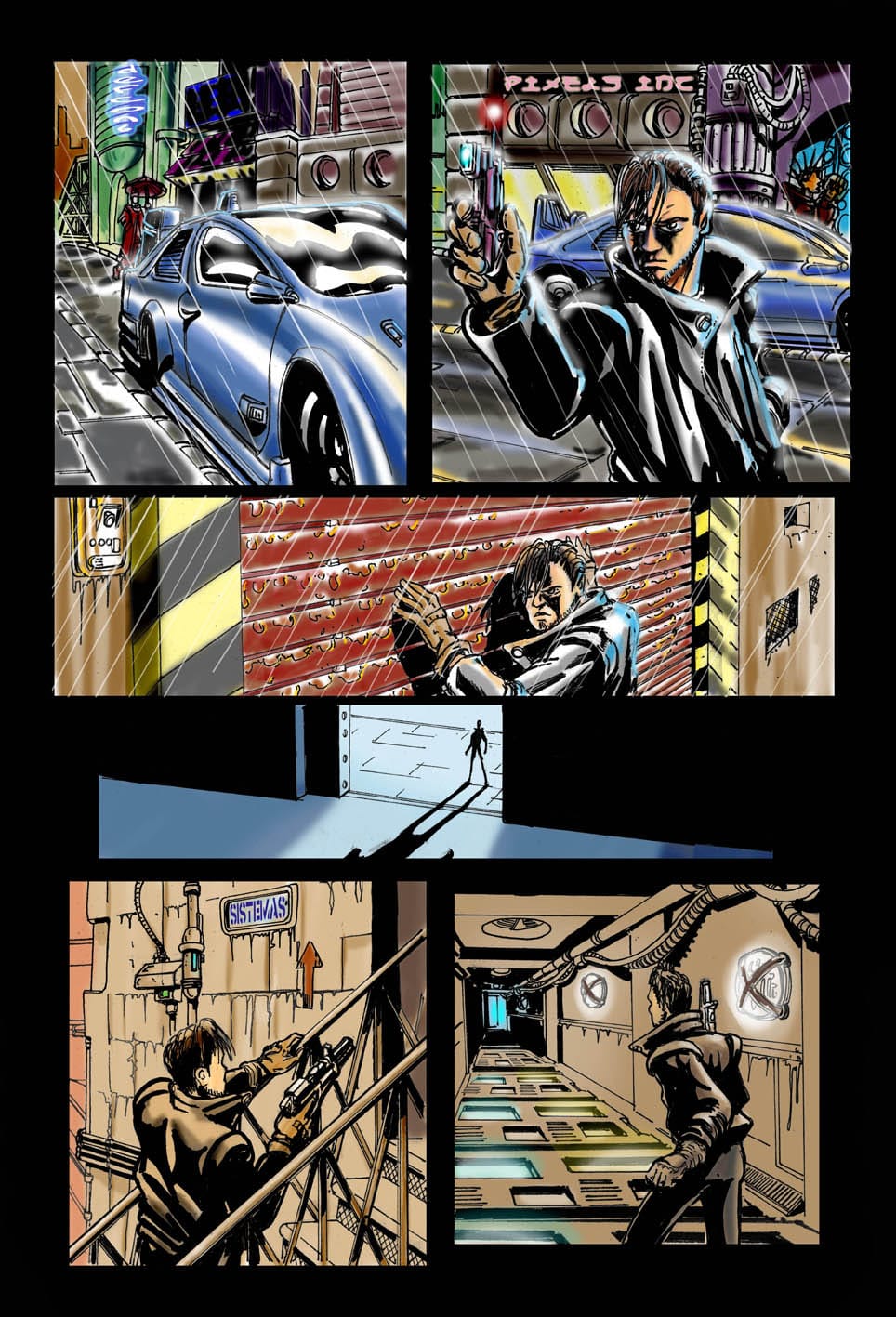 M. C. Carper: Sigo publicando en internet porque antes fui publicado en papel impreso. Y viceversa. El primer laburo que hice con las mismas exigencias de nivel profesional fue SHOCKs, con guiones de Pedro Belushi en Axxón. Eran unas páginas de humor irónico con toques de CF. No sé cuantas hicimos, pero un día me cansé de ese diseño de página de cinco viñetas y justo en ese tiempo alguien colgó un anuncio en el grupo yahoo de Ariel Olivetti. Así empecé a laburar para la revista Landzer y conocí al editor y guionista Machison. Con él hice Las biografías de AC/DC, el Inner Circle y Mortal Zombie. Fue gracias a internet y es maravilloso. Un medio gratuito que comunica a todas las personas del planeta en tiempo real. Es lo más democrático que conozco. La verdad nunca me canso de hacer cosas, cuando estoy por terminar algo aparecen dos o tres proyectos nuevos. En estos días, prefiero dedicarme a guiones propios, entre laburos con guionistas como Marcia Olivieri y Carlos Scherpaz. También estaría bueno laburar con amigos como Leo Figueroa y Augusto Gilimón que siempre tienen historias en la cabeza.