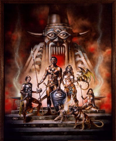 I’m not sure how the idea came to Howard that the ‘perfect’ gift from him to his family would be a family portrait created by Clyde Caldwell—and depicting us as a group of good-looking fantasy barbarians in high REH/D&D™ tradition—but in 1978 that was our Chanukah/Christmas surprise. Howard had managed to surreptitiously send Clyde photos of everyone, including our dog “Flash” (a collie) and when the painting arrived—we were all properly flabbergasted.