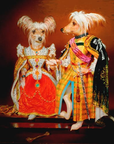 Getting your (human) portrait done was a tradition that fell out of favor in the 1940s to 1950s as interest in abstract and non-figurative art increased. There were exceptions, of course, such as the portraits of “Helga” done by Andrew Wyeth…but in the 1960s and 1970s there was a revival of in portraiture, with the unforgettably powerful paintings of English artists such as Francis Bacon and Lucien Freud and the American artists such as Andy Warhol and Chuck Close focusing on the human face. Along with this rise, and possibly reinforced by the amazing photographs of William Wegman’s dressed-up weimeraner dogs in the 1980s, has come the astounding rise in animal portraiture.