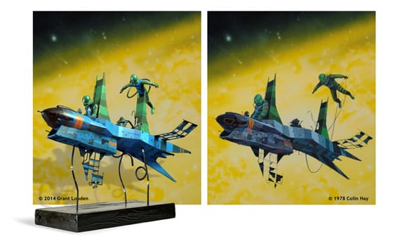 Grant also realized that over the years he had acquired the skills and the tools that would allow him to realize his ambition of bringing those favorite illustrations to 3D life. He selected 12 images from the Terran Trade Authority book series and began contacting the artists – Chris Foss who was “wildly enthusiastic”, Colin Hay, Tony Roberts and the late Peter Elson’s sister with a request to license the works. (Anyone who reads 60s, 70s and 80s British SF ought to be familiar with those artists.)