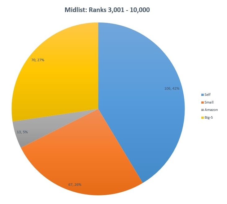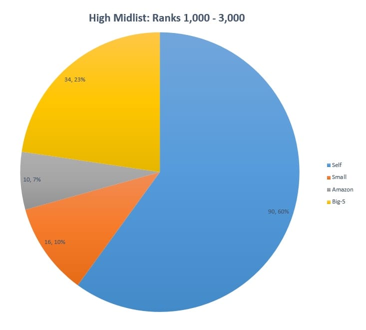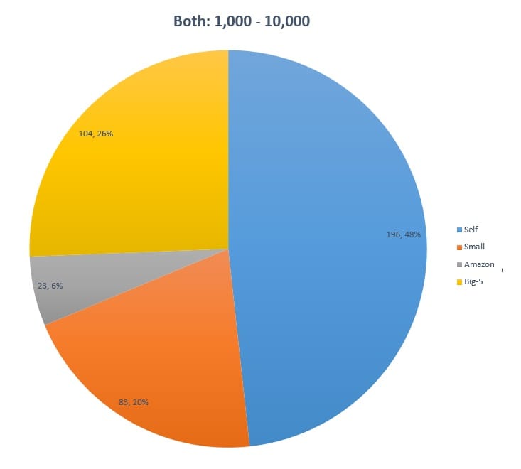 A lot of articles and surveys seem to focus on the very top or the very bottom. For me, I could care less about either of them. For the very top, few will reach this level and those that can already have their acts together. The ones at the bottom, are “not ready for prime time” and probably published prematurely or had a poorly produced book. Authors operating at this level have little chance of success no matter which way they attempt to publish. To me, the important area to focus on is the mid-list. As by definition it is a level that is (a) achievable (b) has room for a large number of authors and (c) produces a good number of sales, such that based on pricing can generate a nice income. So for today’s deeper dive, let’s look at the numbers for those in the 1,000 – 10,000 range raking.