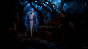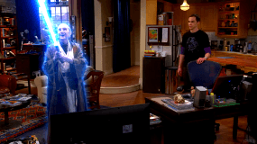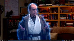 Following a commercial break, and forty-four minutes into the original Star Wars, the boys wonder if they should check on Sheldon, deciding to after they finish watching the Cantina scene, although (Nerd Alert) the soundtrack immediately before Figrin D’an and the Modal Nodes begin playing doesn’t match up with what would be happening in the actual film. As the Figrin D’an and the Modal Nodes begins playing, the camera cuts to Sheldon falls asleep and dreams that Arthur Jeffries appears to him. Never comfortable around Sheldon, Arthur explains that he doesn’t know why he’s in Sheldon’s dream, having hoped that he would haunt his ex-wife. Sheldon suggests that Arthur is his Obi Wan, a term that dream-Arthur is unfamiliar with. As with Penny, dream-Arthur managed to live his entire life without knowledge of Star Wars, so Sheldon explains that Obi Wan Kenobi was Luke Skywalker’s spirit guide, which doesn’t really help dream-Arthur’s understanding. As Sheldon decides this must be the case, Arthur suddenly appears in Jedi robes and with a blue glow, just as Obi Wan, Qui-Gon Jinn, Anakin, and Yoda appeared in the Star Wars films following their deaths. Perhaps the best part of the episode is the glee on Arthur’s face when he accidentally turns on his light saber and starts waving it around to the familiar hum. The fun Bob Newhart was having seems to come through his character.