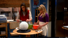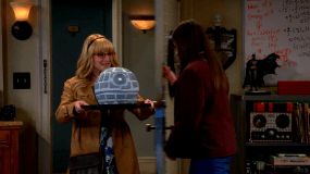 Amy and Bernadette, meanwhile are trying to help cheer Sheldon up and get into the spirit of Star Wars Day by making him a Death Star cake, which Bernadette is concerned might be a little unsympathetic given Jeffries’s death. Just as Bernadette comments on the lack of spherical cakes, gravity exerts itself and they understand why most cakes aren’t round.