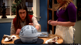 Watching Star Wars: Episode II: The Attack of the Clones, the characters comment on how much Jar Jar Binks has been toned down since the first episode. When Penny notes how stupid he is, Raj takes her to task, saying she’s not allowed to dis Jar Jar, although the boys can. And Amy and Bernadette enter with the Death Star cake, the bottom of which has been cut flat to prevent rolling. Bernadette was less than pleased to learn that they had just started the films over so making the cake didn’t get them out of watching the movies.