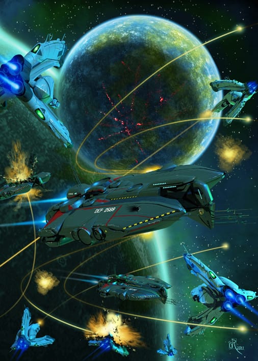G.R.: En realidad es difícil contabilizarlo, algunas llevan más tiempo, otras menos. Pero promediando algo no muy complejo son unas 8 o 10 horas de trabajo. Lo que más tiempo lleva, por lo menos para mí, es conseguir la idea que voy a plasmar. Por lo general me mandan los textos para leerlos y de ahí a sacar una idea para ilustrar. Ahora si me dan un brief de lo que esperan es mucho más rápido. Por ejemplo la portada del libro Enfrentamiento Galáctico Liberando la Tierra fue de esas que salió al toque. Ni siquiera tuve que hacer correcciones.