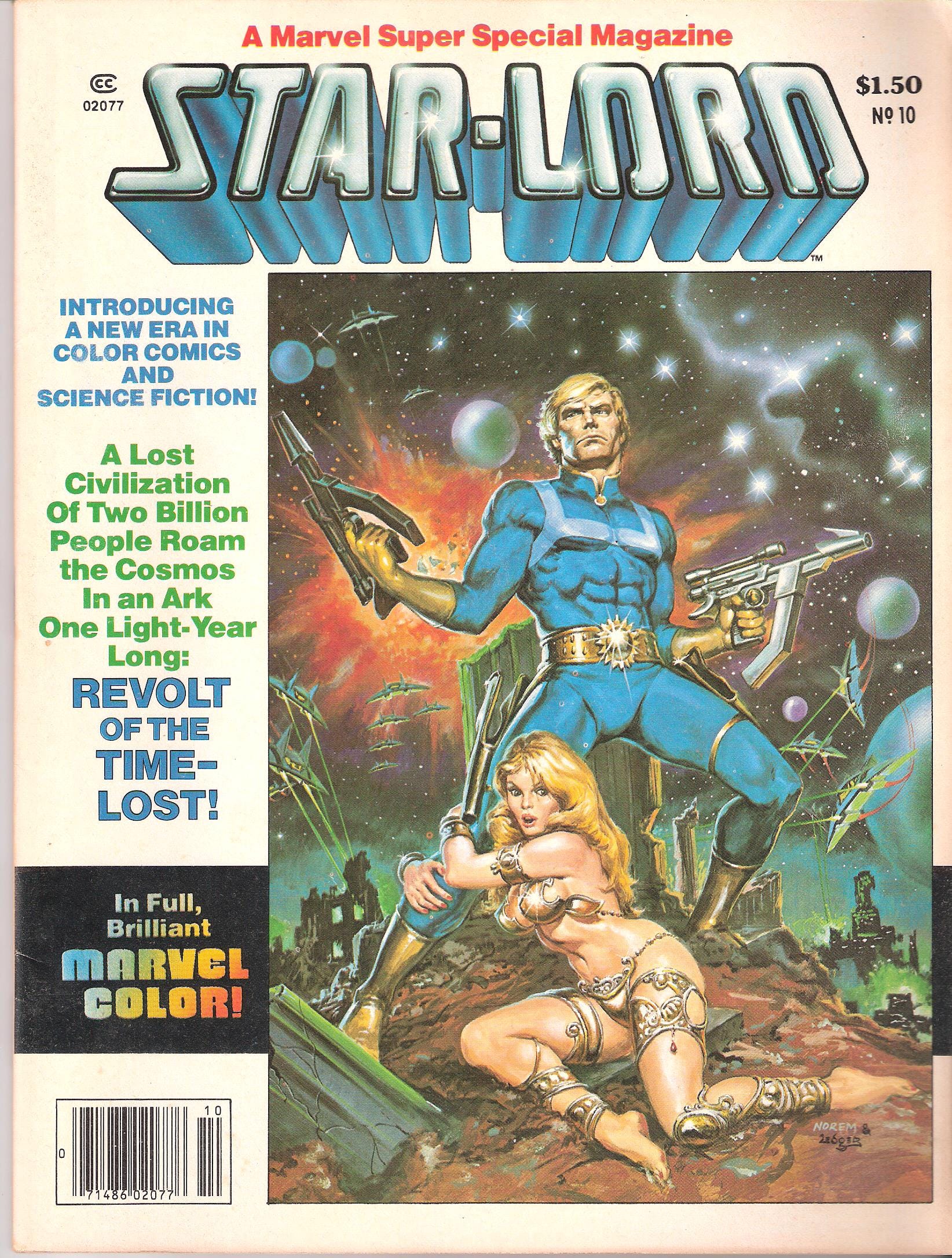 Writer Doug Moench, best known for his work on Batman and his original creations like Aztec Ace, wrote the next several appearances of Star-Lord, in the 1980s. These stories were published both in regular comic book and magazine format (although the magazine stories were in color too). He focused on complete-in-one-issue stories, with outrageous, high-concept ideas. My favorite features a generation ship that’s a full light-year long (And you thought Snowpiercer was big…)