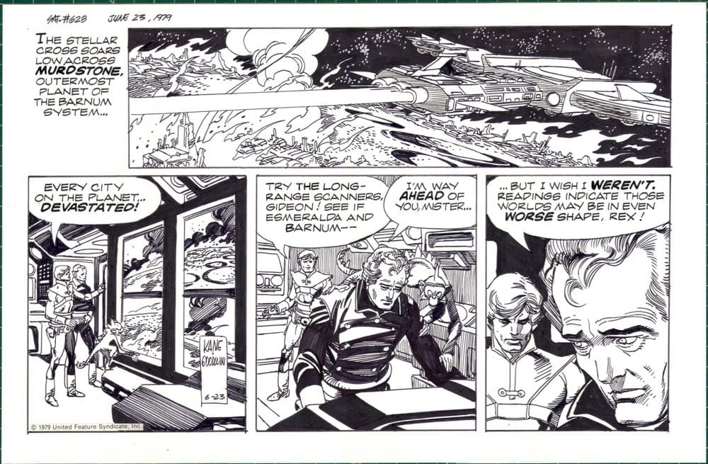 The average Star Hawks strip had four panels, while a standard strip had three. This may not sound like much of a difference, but it was enough to give an artist with Kane’s skills to produce some dynamic layouts. And when Kane and Goulart used fewer panels (as in one of the examples on this page), they could get a wide-screen effect similar to Star Wars.