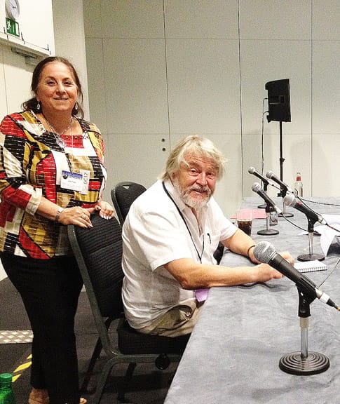 One of the highlights of the con for me, personally, was the opportunity to interview multi-award winner (HUGO, Chesley, BSFA, others) and notable AGOH (DragonCon 2013) Jim Burns on Monday – just the two of us, no script! We managed to fill the 1.5 hrs. scheduled for this without any difficulty, thanks to Jim’s prodigious memory and knack for story-telling. I had sort of forgotten his early days as an RAF pilot . . . and stories of how he started off his career as an artist. He’s now totally into private commissions, and personal works, to satisfy his itch for painting….while still managing to garner commercial commissions (all 6 covers for Interzone magazine 2013 – digitally)