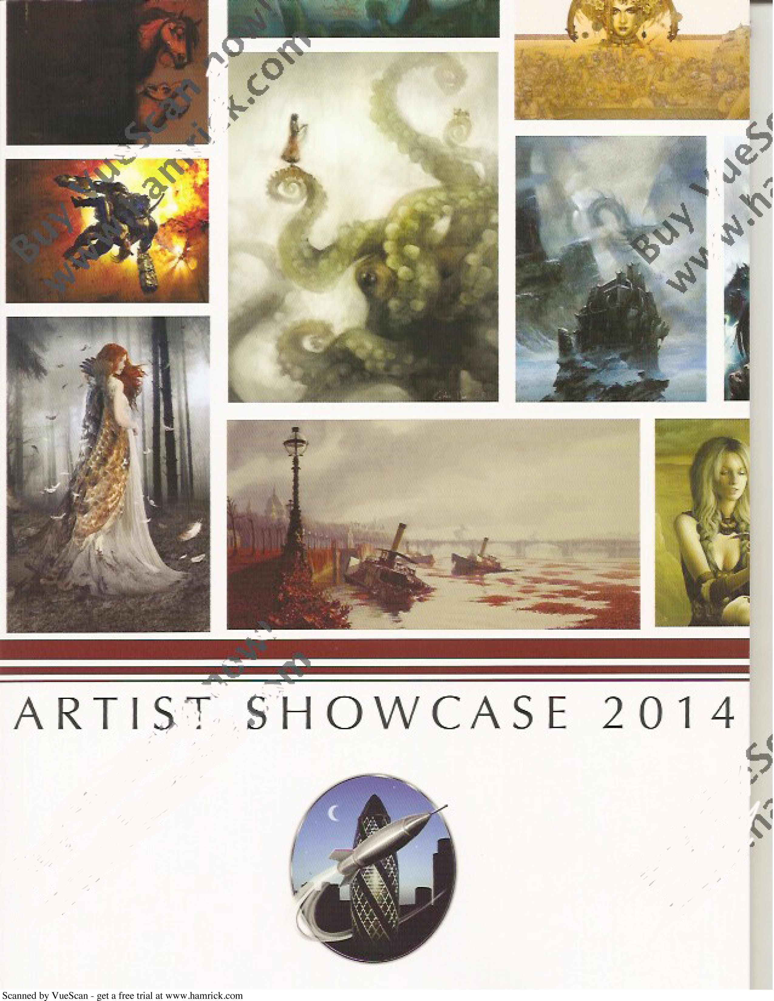 No show is fun when the aisles are so wide that they seem empty . . . even when the attendance is high. This is the feeling you get when displays and art shows – not to mention the people – seem dwarfed by the spaces. I understand why this is done. But. There are pros and cons to this. On one hand: having a huge art show AND setting attendance records AND making it easy for people to pre-order the Artist Showcase 2014, edited by Colin Harris and Sara Felix, made it possible for them to produce a terrific, 96-page full-color printed compendium featuring biographies and artworks from the artists participating in the show. At the same time, putting on an unvetted art show that includes 100 artists is bound to be of inconsistent quality. Plus, having so many panels on display, It was practically impossible to remember where artists were located, or see the entire show without several visits – which I am not sure many people did. There were too many other diversions. Isn’t it time for Worldcons to jury in the art, like World Fantasy, and provide a map for the displays? I have been begging for those for years! In any event, from what I could tell “bigger” didn’t mean there were more items going to auction, or – based solely on anecdote and observation – more sales being made. Artists did “ok” but not fantastically well. Are those days over?