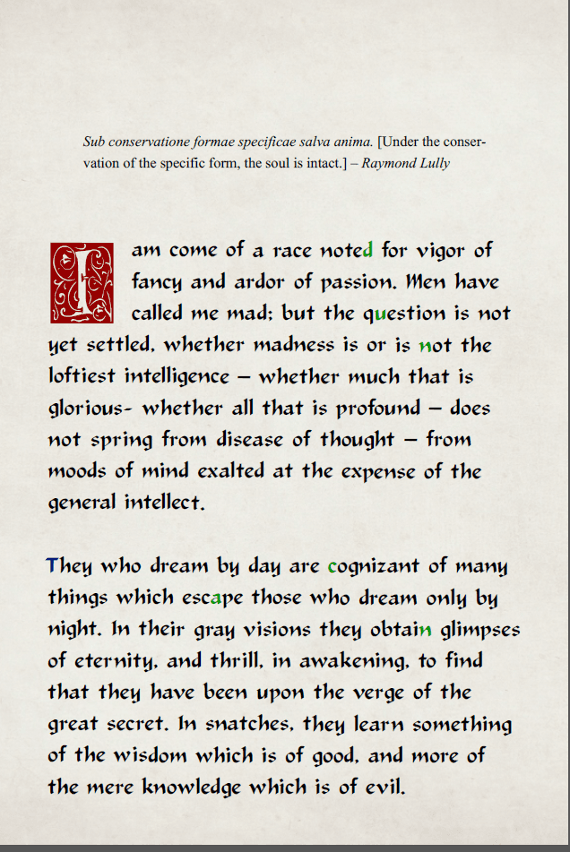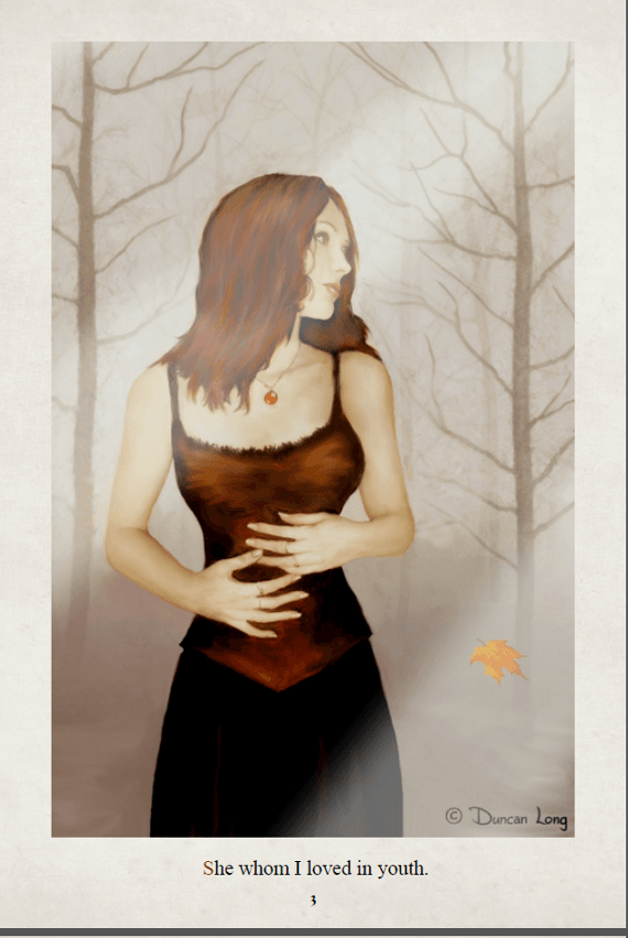 The font, the paper (neo-parchment), the illustrations and the layout are all parts of a gorgeously rendered whole. It would not be fair to the reader nor to Duncan (or to Edgar!) to present this work in anything other than its original format. We have therefore decided to present a gallery of the images contained in this short book and provide the original PDF format as well.