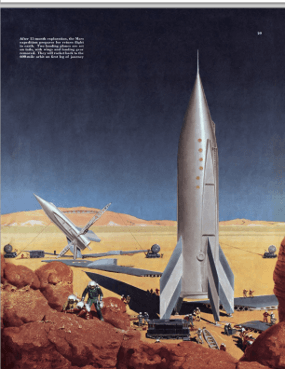Right at the beginning of that craze, Collier’s magazine (starting in 1888, it built itself a reputation for hard-hitting social reform) began running an 8 part series, gorgeously illustrated by Chesley Bonestell, an artist who brought reality, research and verisimilitude to his illustrations of space craft and other planets.