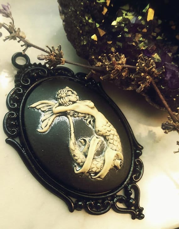 Now this is just lovely, and oozes class. The mermaid cameo is made out of resin, and comes with a brass chain. A great deal, that is sure to win you favor.