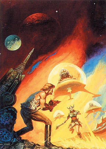 The short answer: NO. Try as I might to inform, educate, expose, advertise, sell, you name it, some of these artists (AND AGAIN, I THINK YOU WILL BE ABLE TO IDENTIFY WHICH ONES, WITHOUT ME :)) they simply failed to launch. YES, this partially (I’d like to think, largely) can be blamed on trends in collecting, generational differences, the evolution of the field…factors which worked to popularize color over black-and-white (hindering sales of art for Gleeson), published vs. unpublished, and certainly in-genre SF/F over gothics, romance, horror, action/adventure, military art, or even advertising with imaginative themes (penalizing Barr, Hinge, Valla). YES, having a depth and width of inventory certainly helped when it came to highly prolific artists such as Berkey and Powers. There was something for everyone.