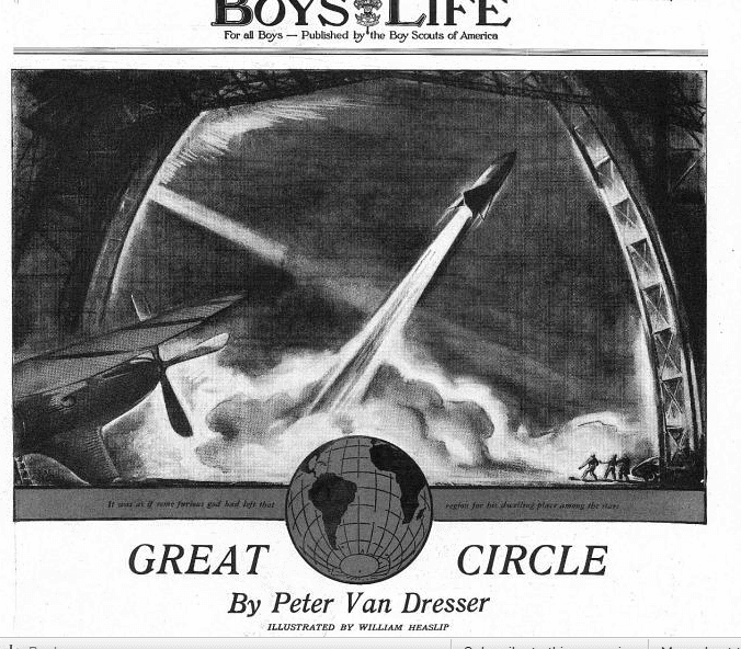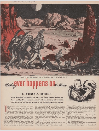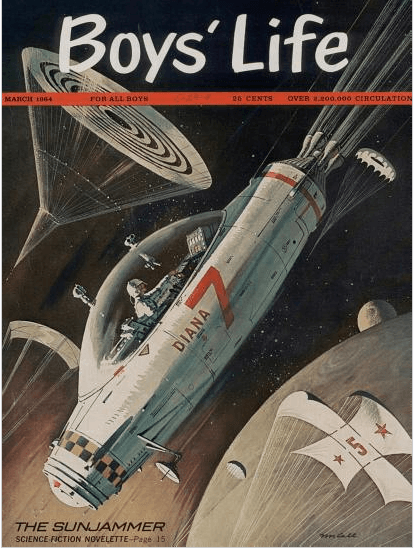 We’ve long known that several Heinlein juvenovels originally appeared as serials within its pages; some may also be familiar with the seminal illustrations of lightsails prepared for Arthur C. Clarke’s story Sunjammer, or the illustrated version of Heinlein’s Between Planets that appeared on its pages. But while there wasn’t a whole heck of a lot of SF published by Boy’s Life, there was a lot more than most are familiar with.