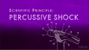 The scene cuts to Howard putting all his weight onto the end of an incredibly long stop sign. As alternatives, Raj suggests a Star Trek phaser. Howard dismisses the idea since a phaser has too broad a beam. They need something precise like Superman’s heat vision. Sheldon suggests Green Lantern’s ring which could make a big green hand to unscrew the lug nut. Raj suggests that the perfect big green hand belongs to the Hulk, but Sheldon doesn’t think he could get past the border. This is the sort of fan geekery that the show once excelled at, but which it tends to shy away from. And as it gets going, Leonard puts on the brakes but applying real life logic, just as he did earlier when talking about the Batmobile. But his interruption leads to a fantastic sequence in the episode which the writers have never attempted before. What follows is a montage of the four using a variety of scientific principles to loosen the lug nuts, each one introduced with a screen wipe explaining what principle they are using…“Percussive Shock” leads off with Leonard rhythmically hitting the lug nut. Raj starts clapping in time and Howard begins singing “We Will Rock You.” Sheldon joins in and just as Raj, Howard, Leonard, and the