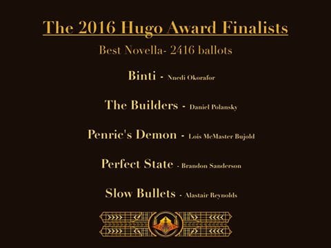 | Binti– Nnedi Okorafor Penric’s Demon– Lois McMaster Bujold Slow Bullets– Alastair Reynolds Perfect State– Brandon Sanderson The End of All Things 1: The Life of the Mind– John Scalzi Speak Easy– Catherynne M. Valente The Builders– Daniel Polansky | Fear of the Unknown and Self-Loathing in Hollywood, Nick Cole, Tales of Tinfoil Penric’s Demon, Lois McMaster Bujold, Spectrum Perfect State, Brandon Sanderson, Dragonsteel Entertainment The Builders, Daniel Polansky, Tor.com Slow Bullets, Alastair Reynolds, Tachyon Publications |