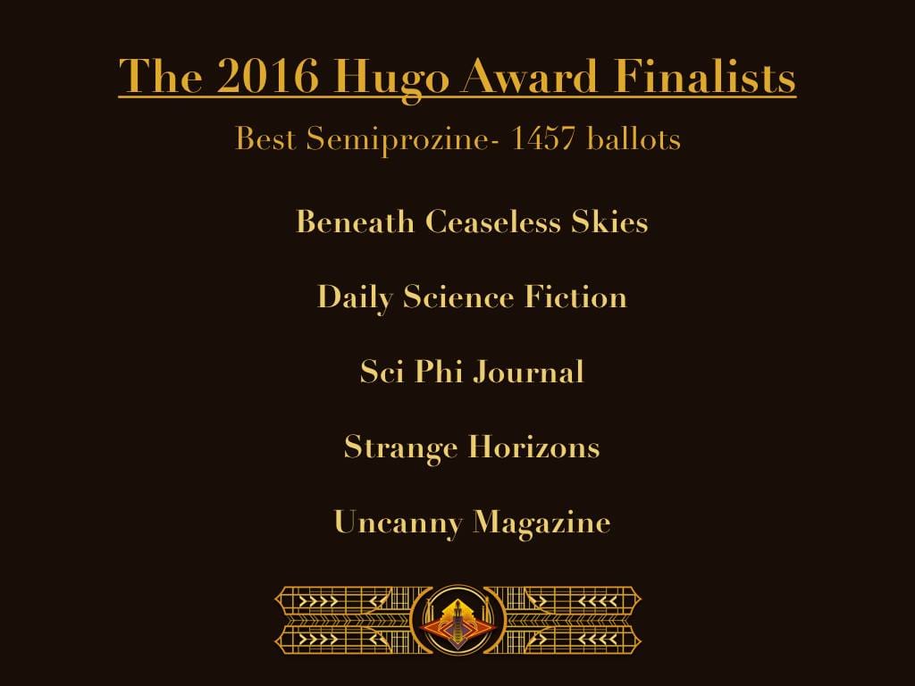 | Sci Phi Journal | Abyss & Apex, Wendy Delmater Beneath Ceaseless Skies, Scott H. Andrews Daily Science Fiction, Jonathan Laden and Michele Barasso Sci-Phi Journal, Jason Rennie Strange Horizons, Niall Harrison |