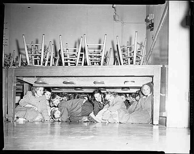 For the friends I spent time with hiding under a desk…does the threat of nuclear war with North Korea or with Iran hit you in the same way concern over the Soviets and “Red” China did back in the day? Or does the current situation seem like little league compared to the Bigs? Somehow, nuclear armageddon without the assurance of world-wide mutual destruction just doesn’t feel the same to me. Still and all, I don’t ever remember the US acting in a way towards another nuclear power the way Trump has been acting towards North Korea. It reminds me of an anti-social brat poking caged lions and tigers with a pointy stick…having entirely forgotten than cages have doors and animal keepers are human….