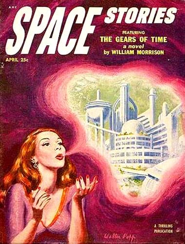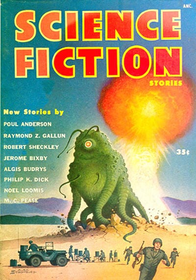 I think it safe to say that the majority of magazines back in 1953 still felt the need to be very specific about what they were offering readers. The cover image was apparently not quite enough, though I’m sure they worked hand-in-hand: the outre image would catch your eye and the properly worded title would confirm your suspicions: rocketships plus “Amazing” equals “science fiction”. (Anyone seeing a scantily clad “space babe” and hoping for titillation was going to be sorely disappointed, and unlikely to be interested in anything “science stories”.)