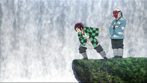Even the viewer not familiar with Shinto will guess that the rope and streamers around the boulder that Tanjirō needs to split signify that it is a very special boulder. The rope is a shimenawa, and by its presence it warns that the boulder is sacred. The fact that Sabito first appears atop the boulder, along with the fox masks that he and Makomo wear, signal that the siblings are spirits that reside there.