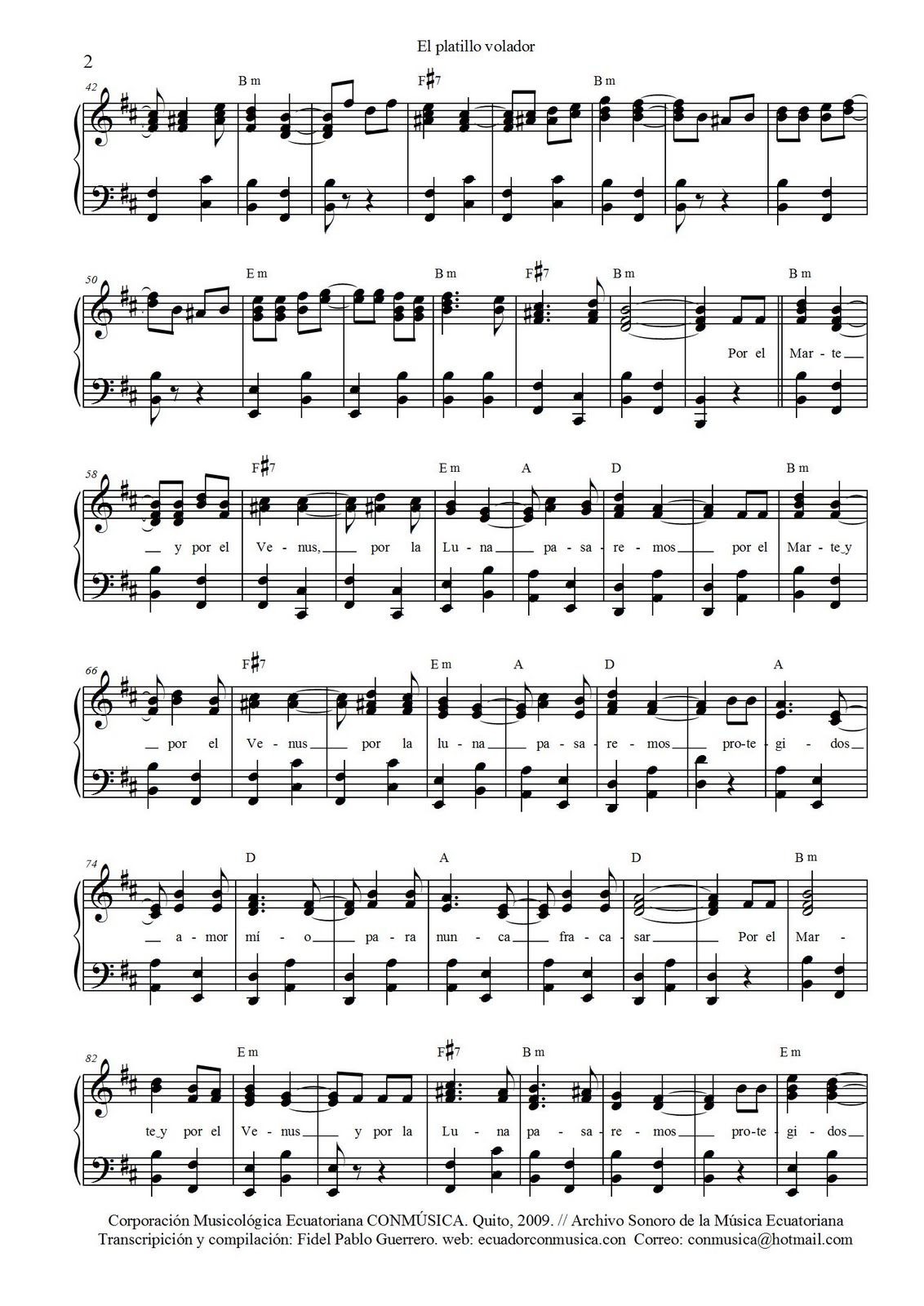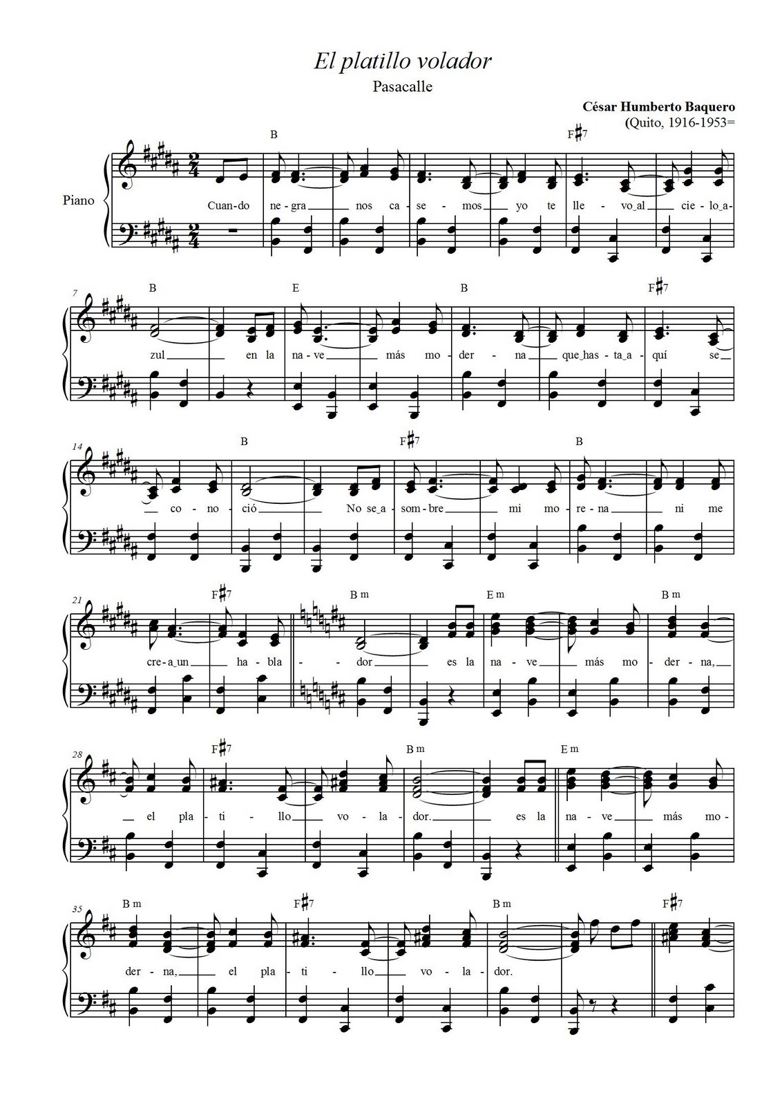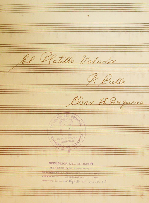 Y probablemente se conecte a este hallazgo otra pieza de 1950, un pasacalle, un tipo de danza ecuatoriana, titulado “El platillo volador” de César Baquero que también Guerrero lo reproduce en su artículo en mención. Tal pieza dice así:
