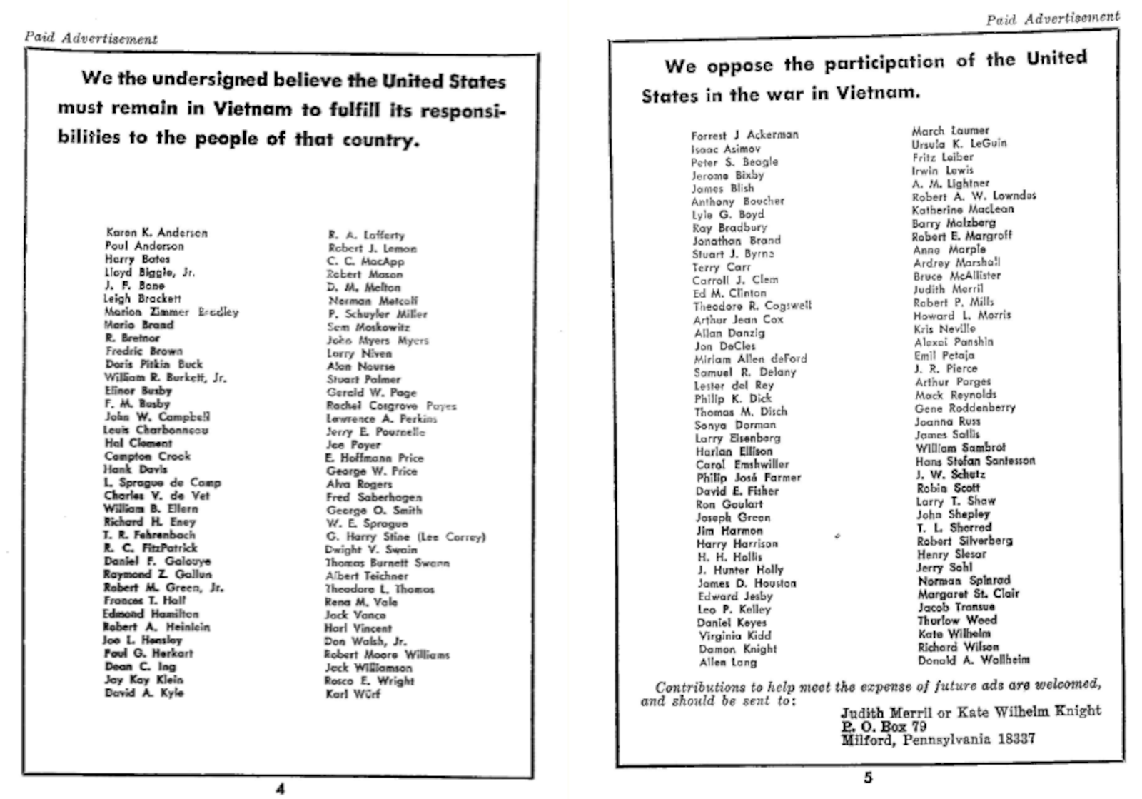 That got so divisive at one point that both Galaxy and The Magazine of Fantasy and Science fiction published two opposing statements, signed by members of the SF community (which, if you recall, was just beginning to get its act together professionally, with the formation of SFWA just three years before). The intent may have been a way to let everyone let off steam and move past the arguments.
