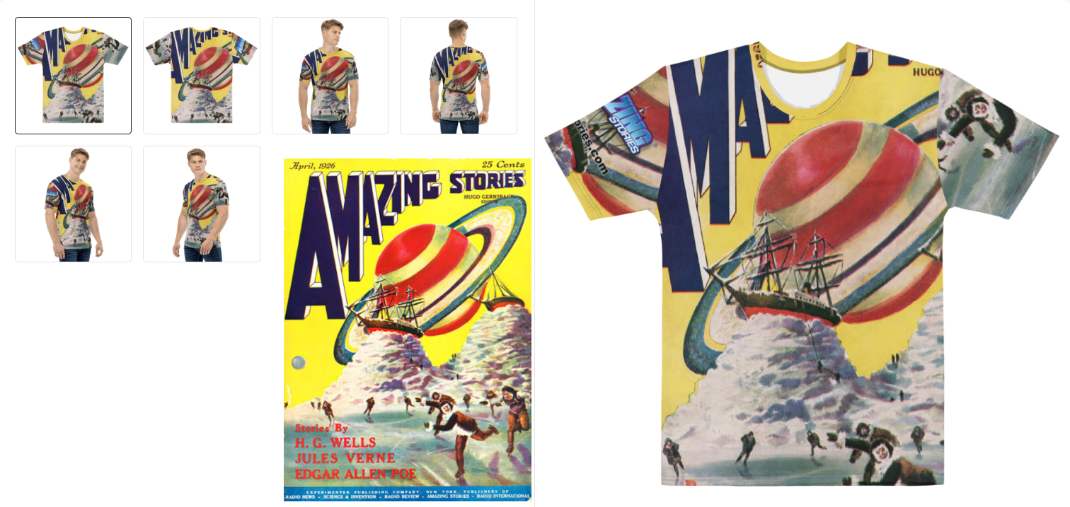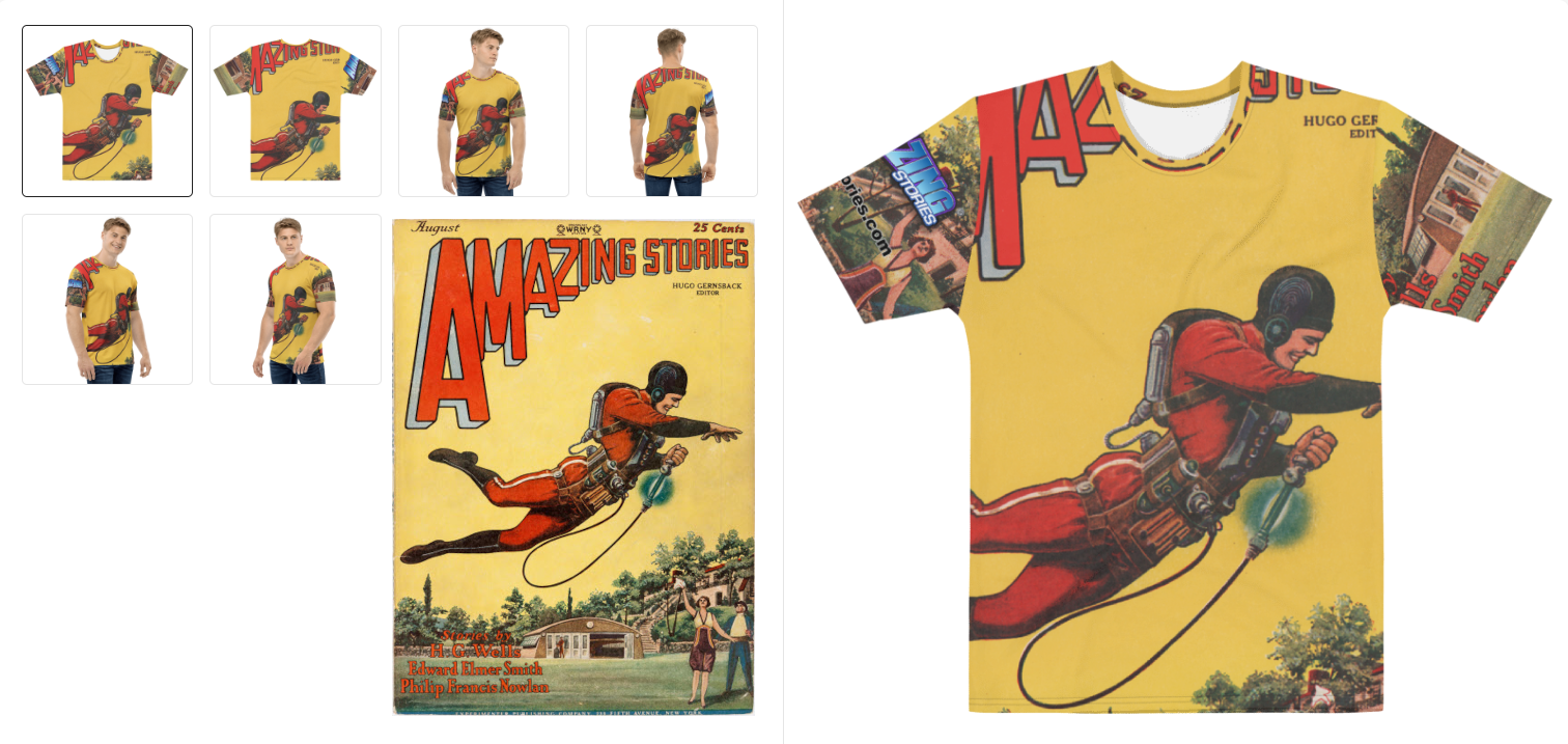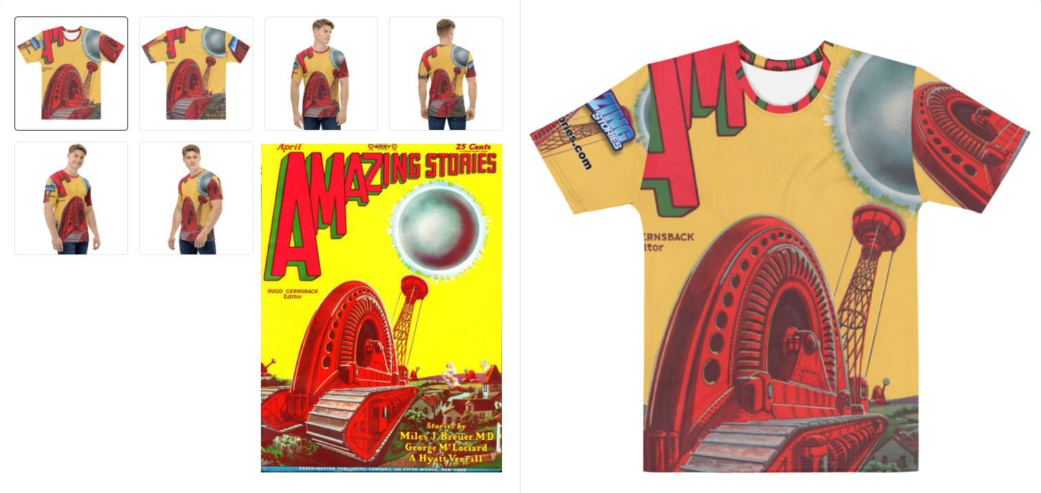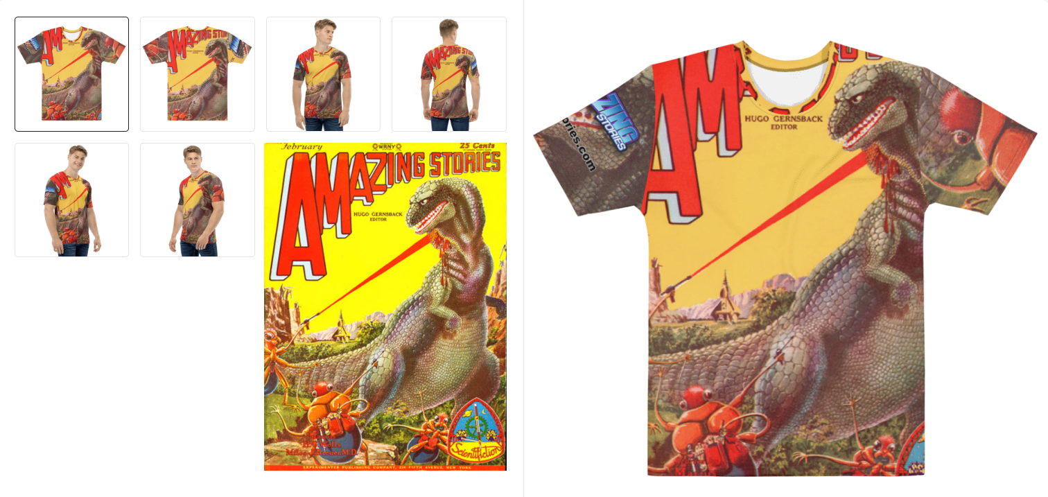 And “Your people” won’t have any trouble picking you out of the crowd as you attend in true Fannish Style with Amazing Stories’ new line of Convention Wear(TM), all-over print casual Ts.