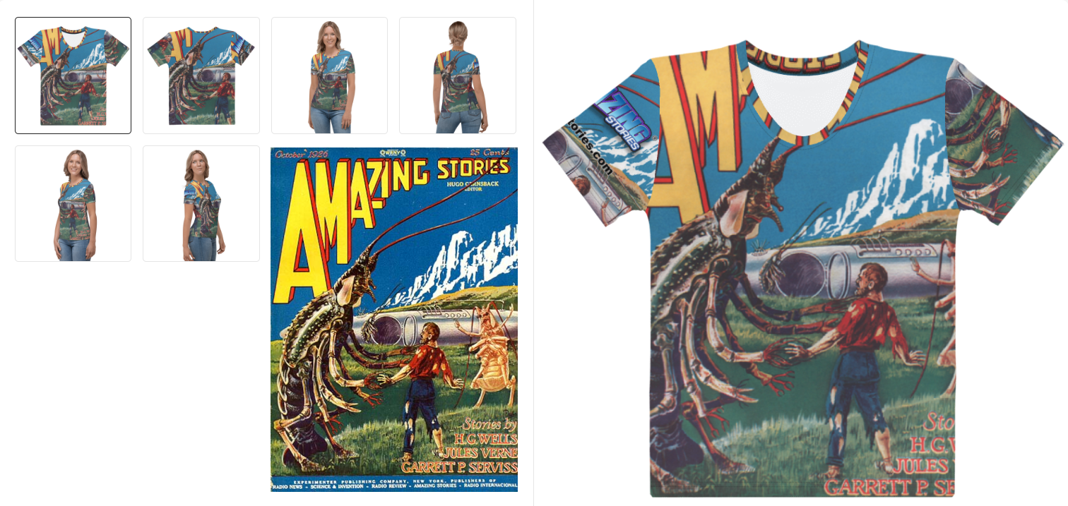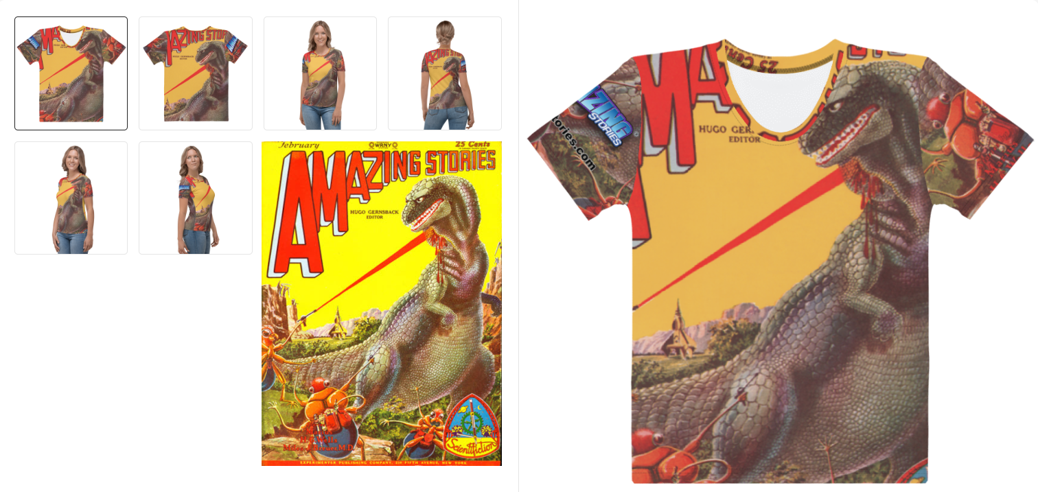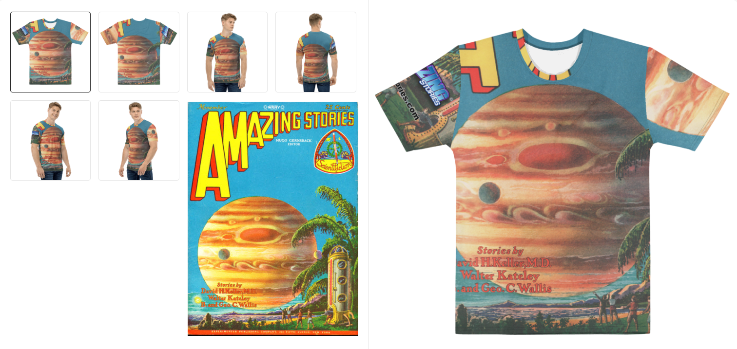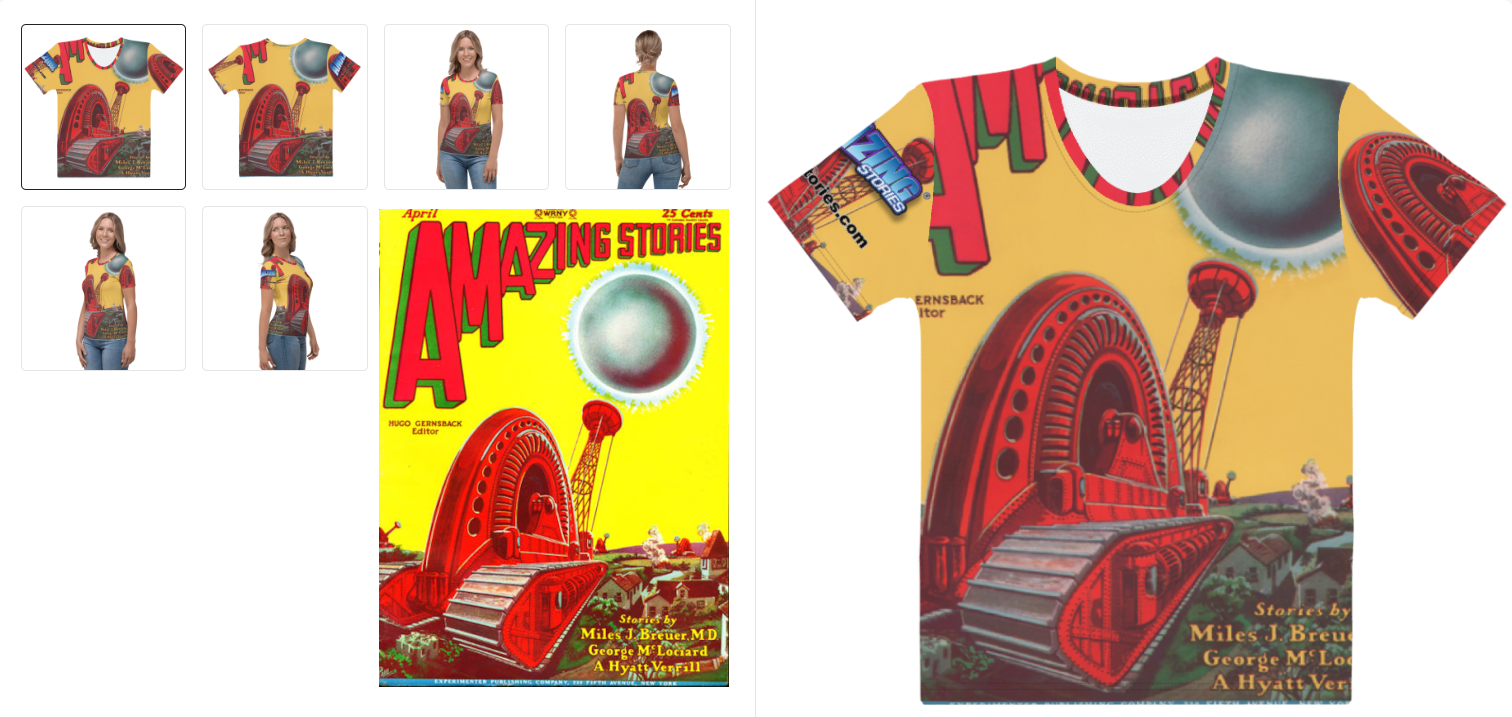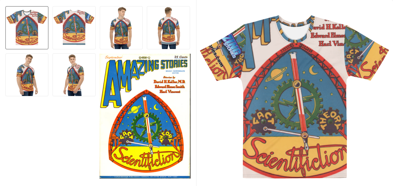 And “Your people” won’t have any trouble picking you out of the crowd as you attend in true Fannish Style with Amazing Stories’ new line of Convention Wear(TM), all-over print casual Ts.