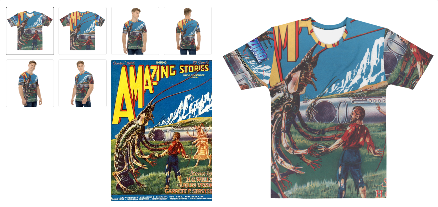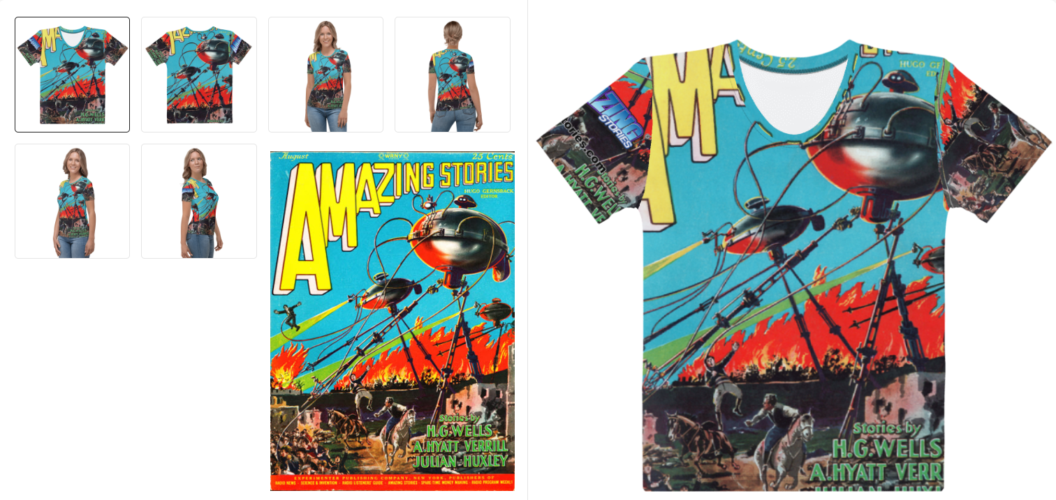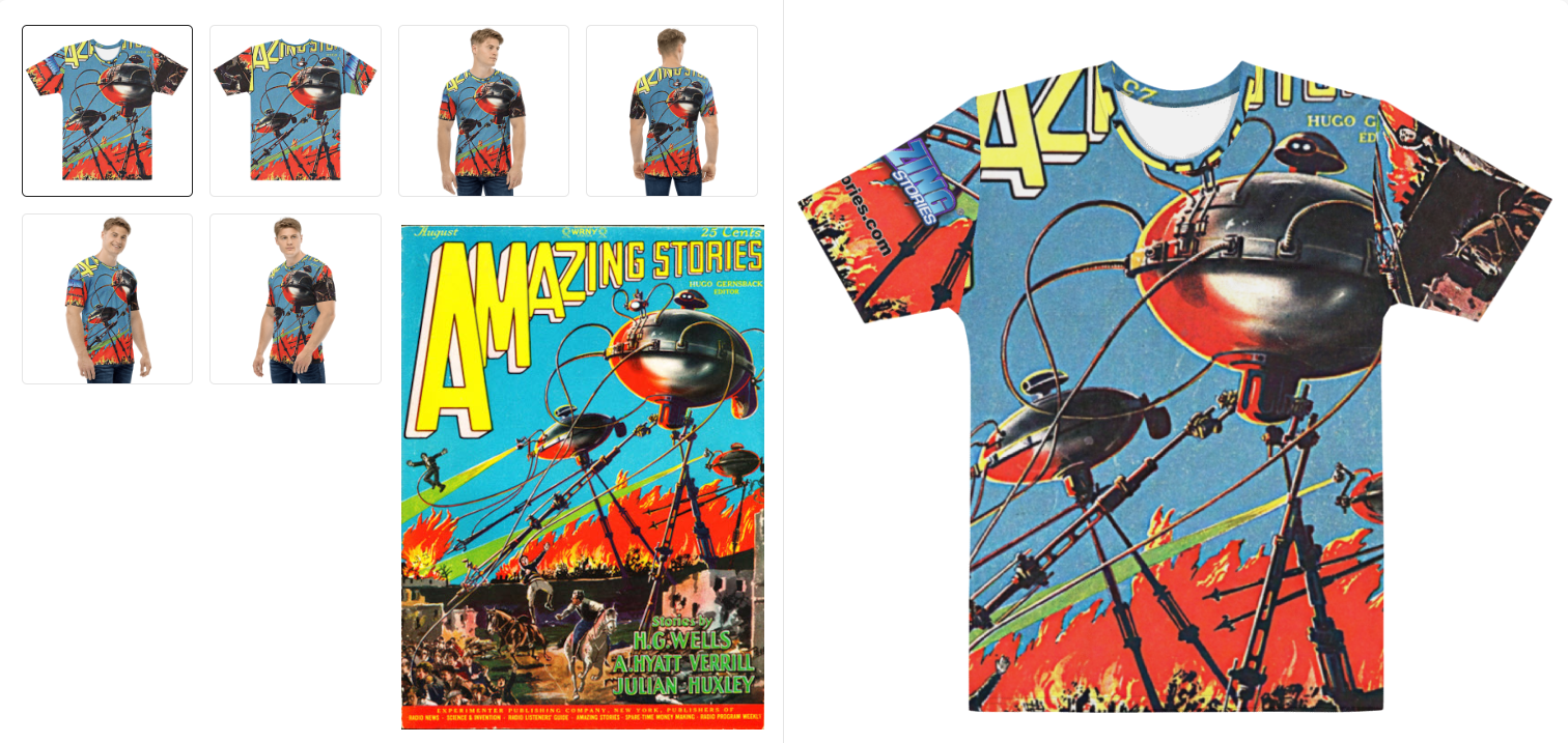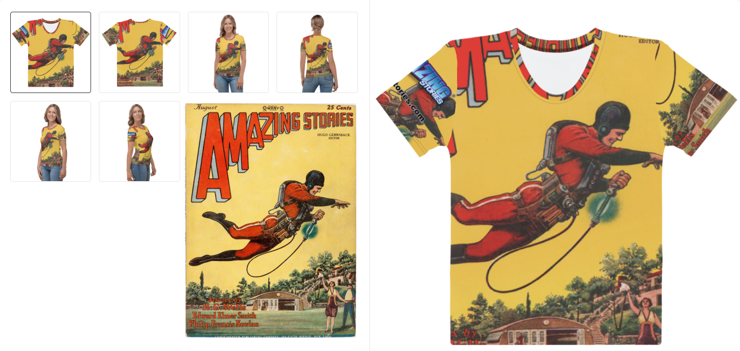 And “Your people” won’t have any trouble picking you out of the crowd as you attend in true Fannish Style with Amazing Stories’ new line of Convention Wear(TM), all-over print casual Ts.