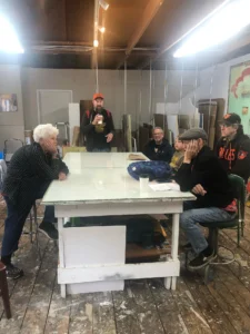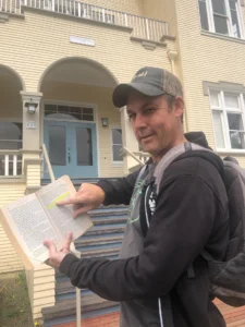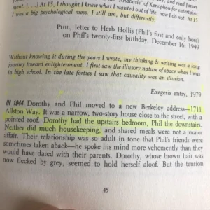 Next, we went to the Alliston house. Phil and his mother moved into the house in 1944, and Phil lived with her through high school. When we walked up, there was a man sitting outside eating an apple. He knew that Phil had lived there. He was amused by a dozen people stepping up to look at his house. I told him Phil lived downstairs. “There is no bedroom down there.” I showed him the mention of his house in Divine Invasions. He looks at the book and then at me. “Come inside, you tell me where you think he made his room.” Once I was inside (wow, totally amazing) we both agreed that he probably set up the dining room off the kitchen as his room. I tried to be respectful and not take pictures.
