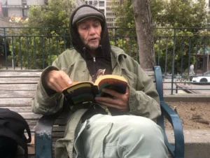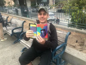 We took a break, and I went and got an amazing vegan Reuben at the Butcher’s Son vegan deli. When we met back up, we took the ferry into San Francisco. We got a robot taxi that took us to Portsmouth Square. One of the most powerful scenes in PKD’s Hugo Award-winning classic took place at this park when Tagomi sat on a bench and moved between worlds. Sitting in the spot David Gill read the entire scene. It was powerful hearing those words in a 2025 reality that would have looked as shocking to Phil, who wrote about this spot decades ago.