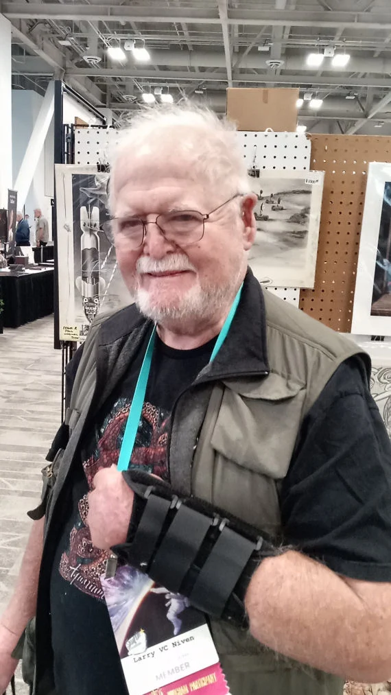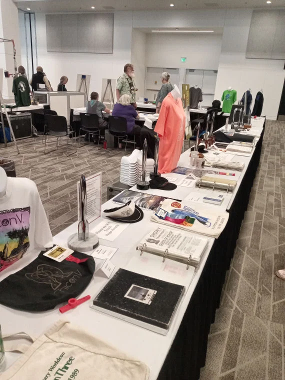 I must apologize for the quality of the photos; I decided not to take my DSLR but instead depend on my ZTE phone. Said phone is not user-friendly; it decides what and when it will do something like take a photo. And these photos aren’t necessarily in any particular order. So. I first attended an SF convention in 1975; it was Westercon 28 in Oakland, California. I drove down from Pullman, WA with my best friend and two fellows from the fan group I’d started in Moscow, ID. My first Worldcon was Kansas City in 1976; the GOHs were R.A. Heinlein and C.L. Moore. I never got to meet the GOHs, though I’d spent time with both Heinleins in Seattle previously, I think. I went—at that time, we did everything fannish together—with the late Jon Gustafson, my Art Editor at my fanzine called New Venture. The Fan GOH was George Barr, and he invited us up to his suite for a private party. I met lots of people; old friends and new. It was for me a great con.