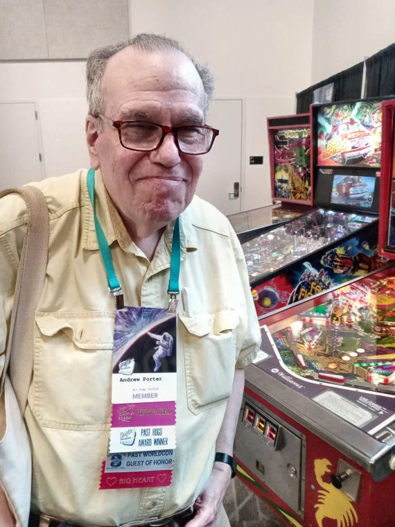 For many years I’ve been going to cons and meeting people in the con bar or restaurant and having great conversations with old friends and new—but to my surprise, neither one was really available here. And there wasn’t a con suite, another usual place to hang out. There weren’t large restaurants within walking distance that we could find; even our hotel, which was less than a block from the convention, had no decent food. But somehow I managed to see a lot of friends (even Andrew Porter in the pinball corner) by staying close to the dealer room and art show.