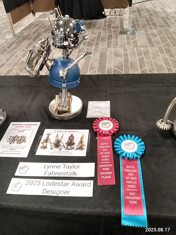 Panels, Registration and (I think) the Hugo Ceremonies (I didn’t go or see it) were all held on different floors.Lynne’s bots were on a table to your left as you entered the art show, just in front of the Art GOH’s own display. Lynne had come down Tuesday to set up her bots, although she and I didn’t come to the con (which began on Wednesday) until Thursday, if that makes sense. We were late because of a combination of time/timing and not wanting to spend another large sum on a room for the night (I think it was about $300 US/day including various taxes and addons.) Since we’re both retired, it was for us a huge chunk o’ cash.