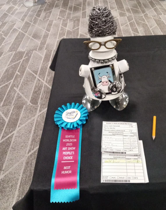 And Lynne won three ribbons (two blues for People’s Choice: Best Humor and Best Convention Theme; and a red: Art Show Judges’ Choice Second Place for Convention Theme) for her bots (Figures 7 and 9). I was, and am, so proud of her! I figure I’m entitled to brag about her.