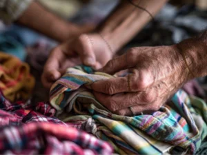 Title/Link to the original image: A man is holding a piece of fabric in his hands.