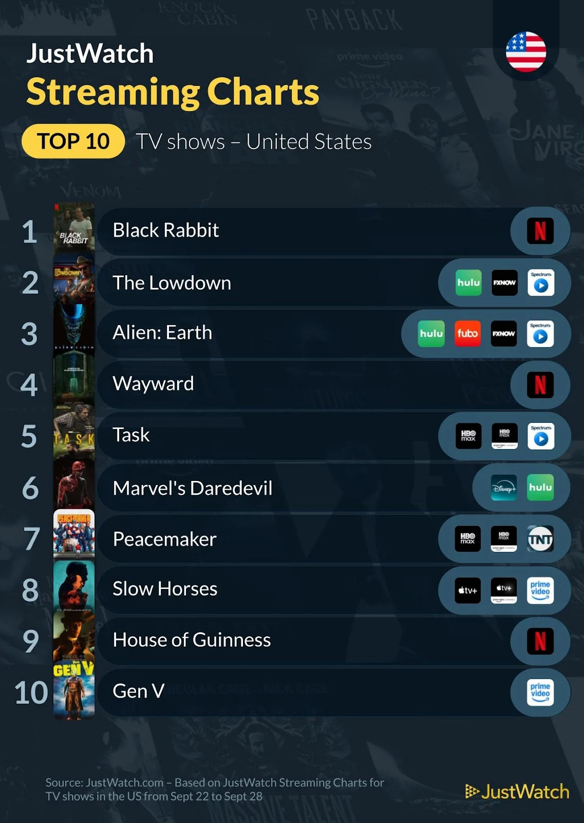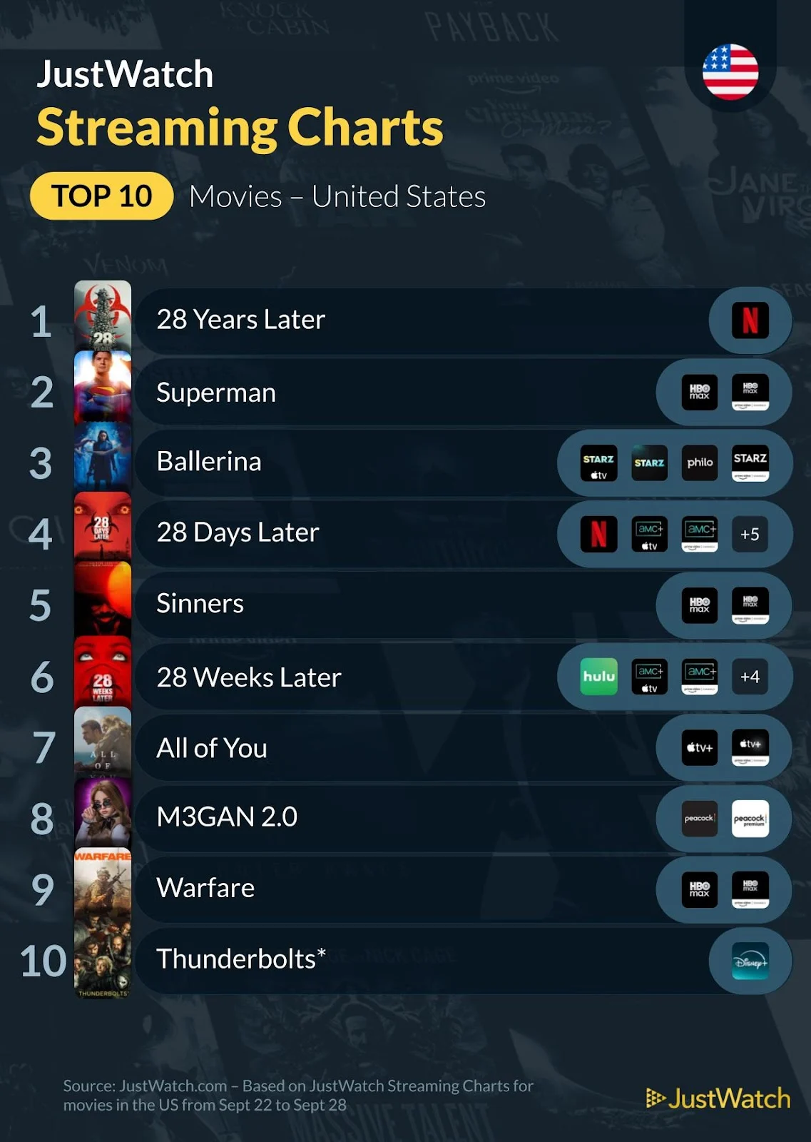 Also, this week we decided to highlight our guide to the sexiest vampire movies like Sinners and where you can stream them in the US. Directed by Ryan Coogler, Sinners has sparked plenty of buzz and climbed to the #5 spot on our US Streaming Charts. Check out the full list here: https://www.justwatch.com/us/guide/sexiest-vampire-movies-like-sinners