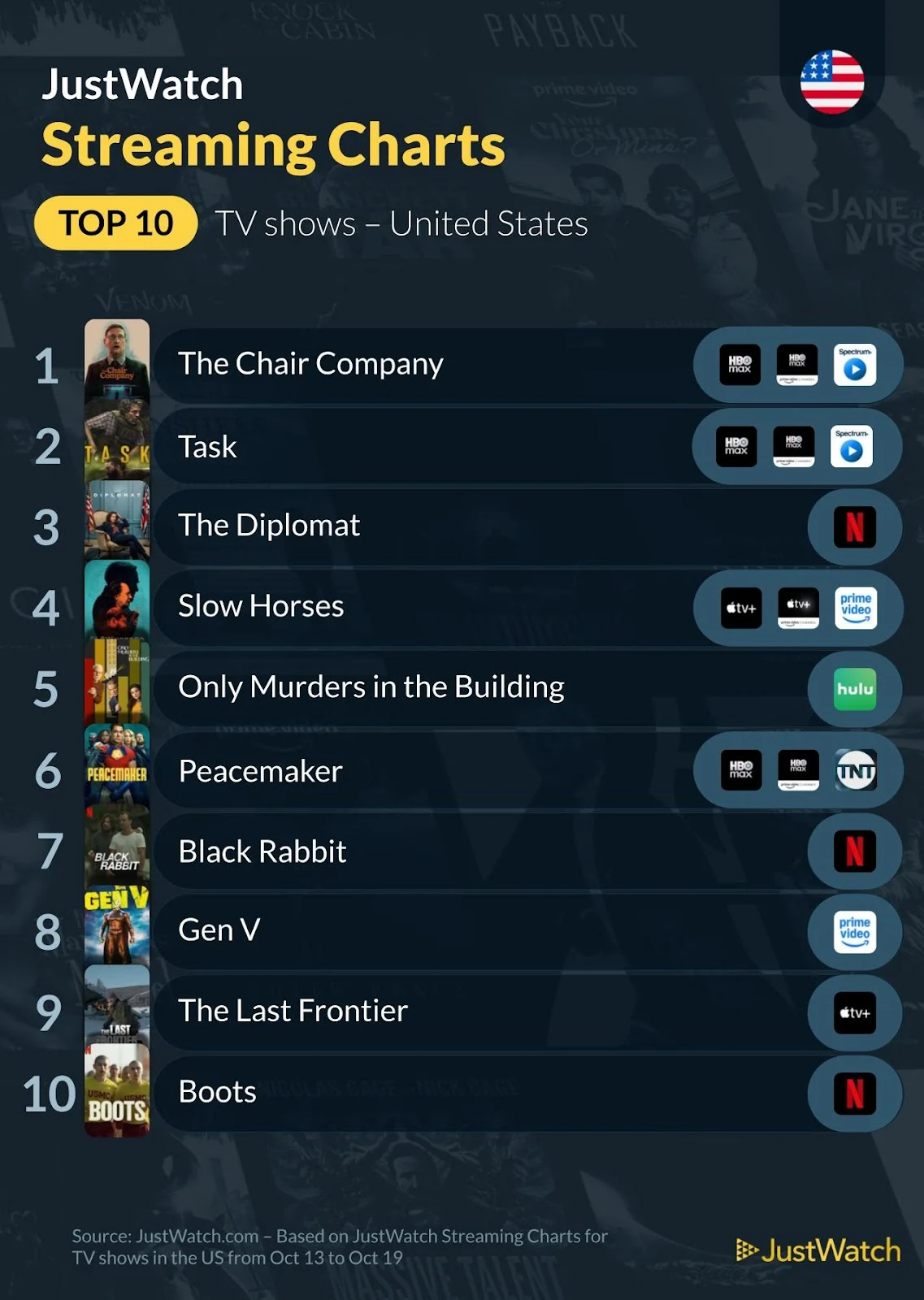 Only Murders in the Building continues its impressive run — season 5 has spent over a month in the top 10.