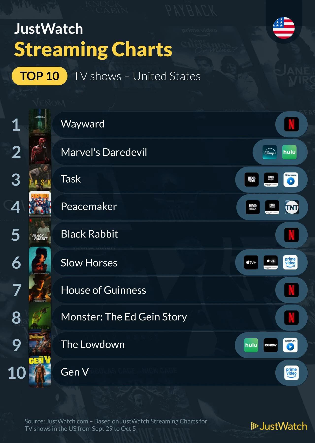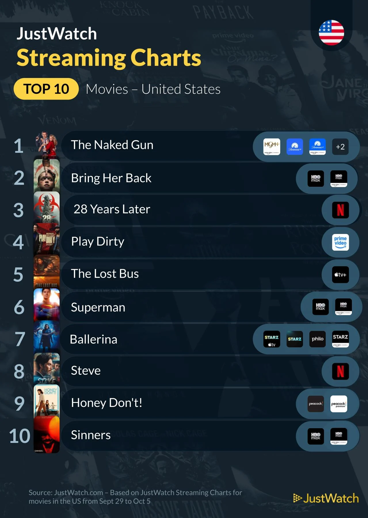 This week we’re highlighting our guide The Naked Gun and 9 Other Hilarious Spoof Movies to Watch Right Now. Since its streaming release last September, The Naked Gun (2025) has shot to #1 on our US Streaming Chart. Check out the full list here: https://guides.justwatch.com/us/where-to-watch-best-spoof-movies.