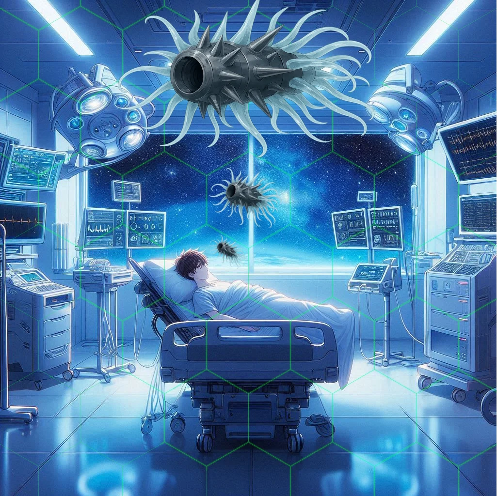 Anton started at the familiar sight. He recognized the darting tadpole bacteria, the lumbering spiky colonies, the luminescent phages shaped like a space vehicle with an octagonal head and strut-like legs. The same alien zoo that swarmed in his own blood.